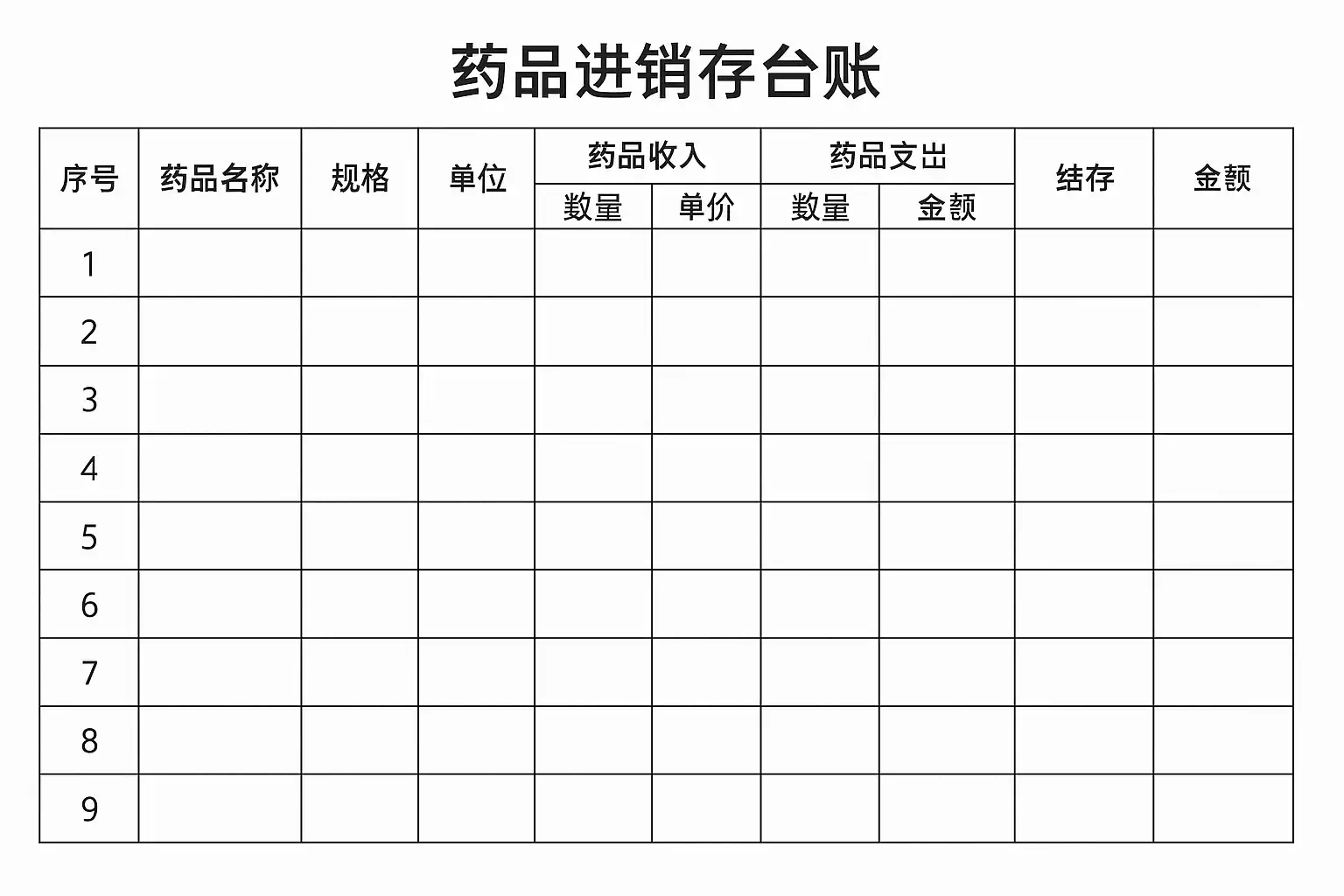 | 序号 | 药品编号 | 名称 | 批号 | 单位 |规格 有效期 入库日期 入库数量 出库日期 出库数量 库存结余 经办人1 YP20240001 阿莫西林胶囊 A20240610B 盒 0.5g*24粒 2026/6/9 2024/6/15 100 - - - 张三...填写注意事项: