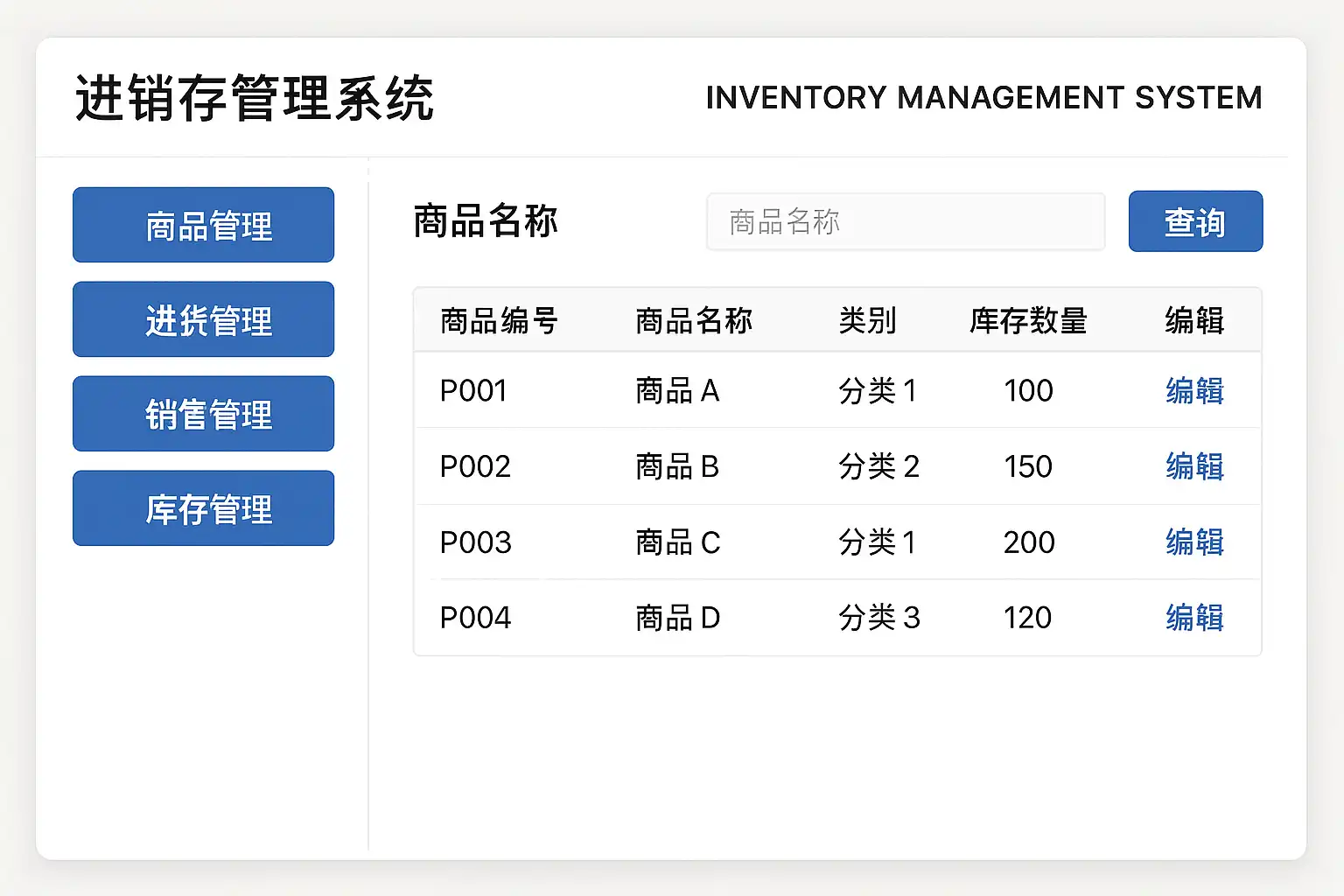 | 仓库台账 | 商品编码, 数量 | 实时反映当前各商品剩余数量 |