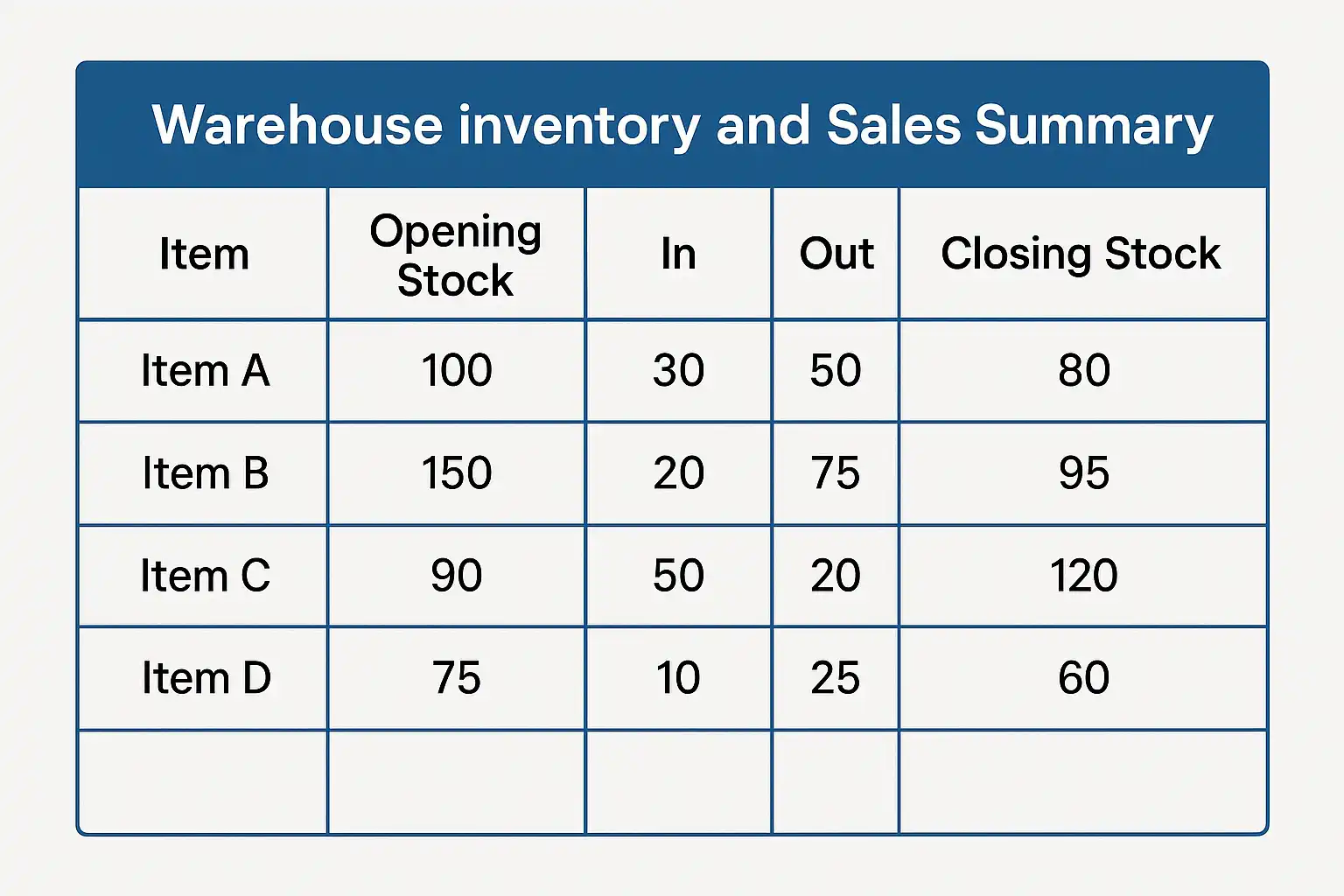 - 自动计算:结余库存=期初+本期采购-本期销售±盘点盈亏