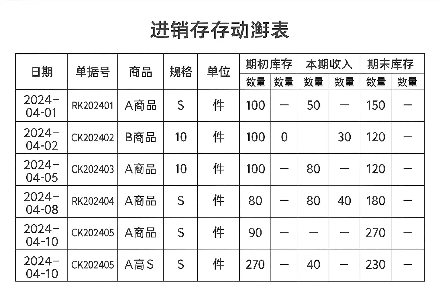 | 月度盘点 | 月初结余、本月购销量、本月结余 |
