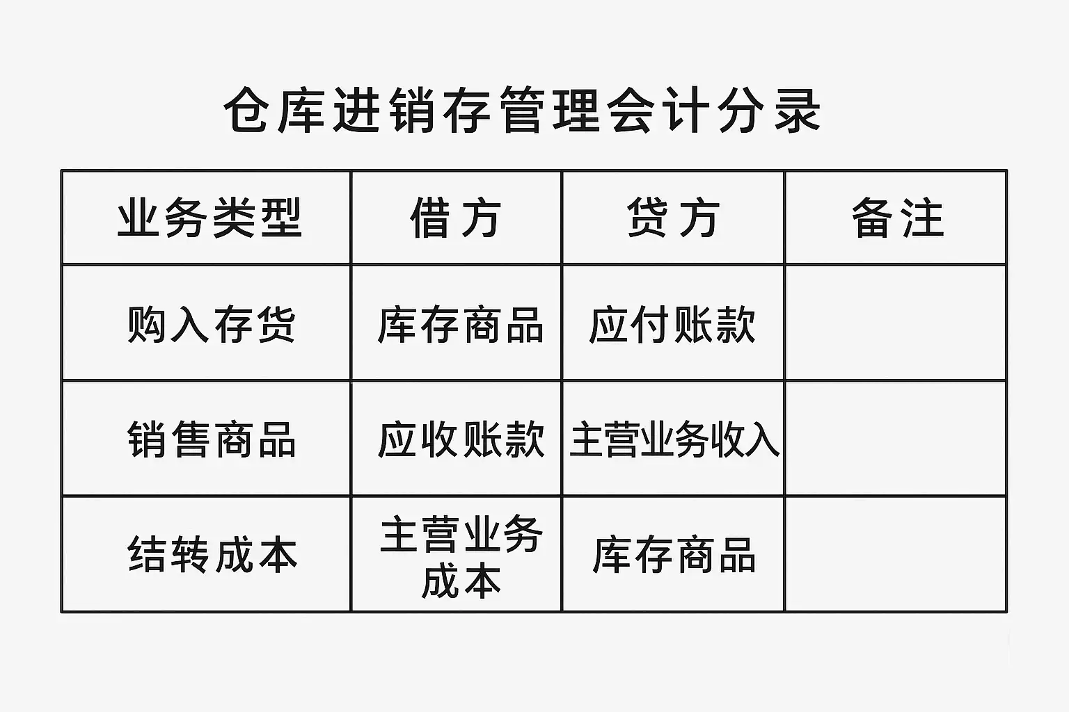 | 采购入库 | 收货入仓 | 库存商品,应付账款 | 借:库存商品 |