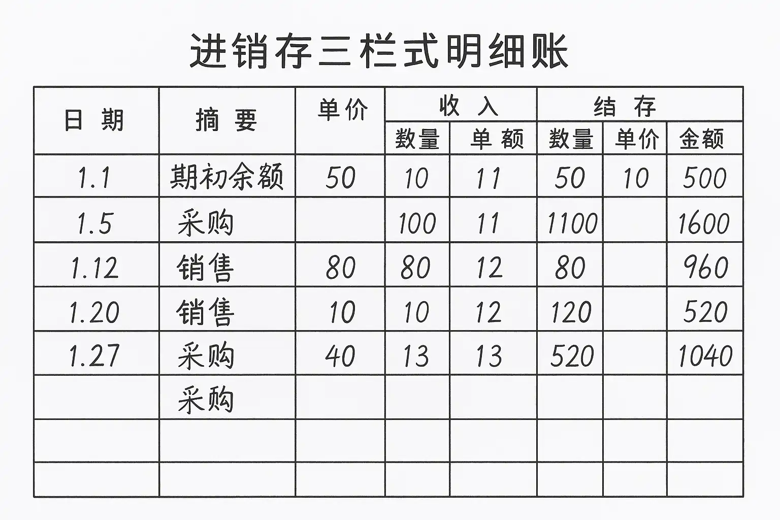 - “结存”:每次业务后实时更新剩余数量及金额。