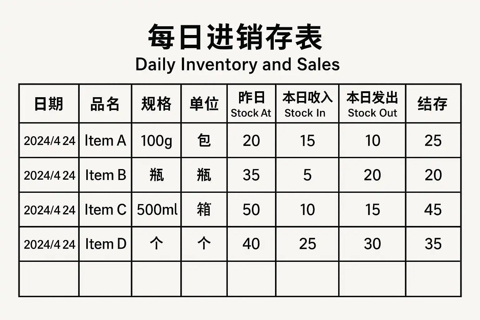 每日进销存表是反映企业每天商品或原材料采购(进)、销售(销)、库存(存)动态变化的重要管理工具。它不仅帮助企业及时了解当天各品类商品的库存状况,还能辅助采购计划制定、防止缺货或积压,为企业运营决策提供数据支撑。