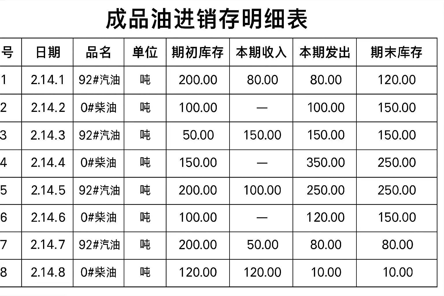 通过上述结构,可以系统化管理成品油库存,提高数据准确性与管理效率。