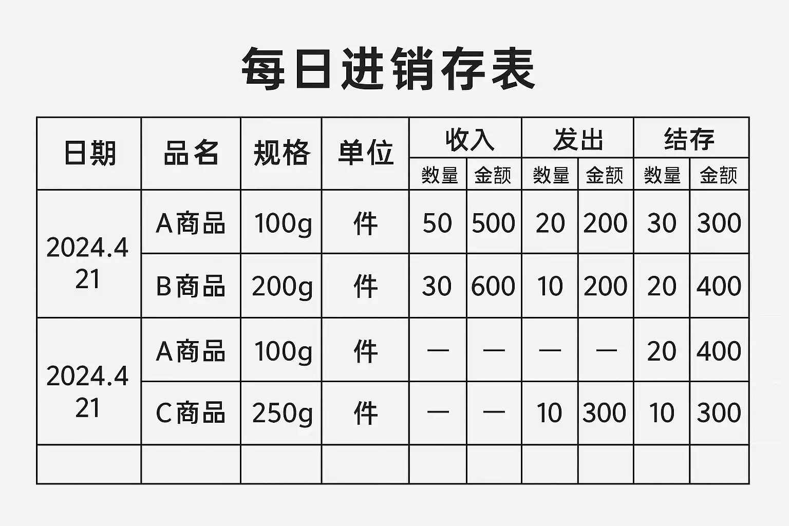 以下为常见每日进销存明细表结构示例: