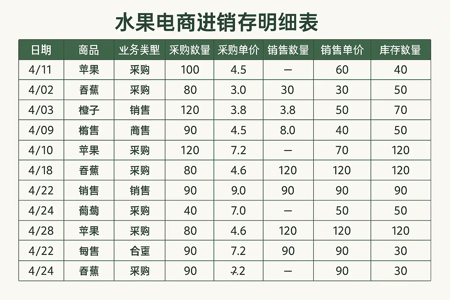 水果电商业务涉及商品种类繁杂、保质期短,对进销存数据的实时性和准确性要求极高。一个科学合理的明细表需涵盖以下内容: