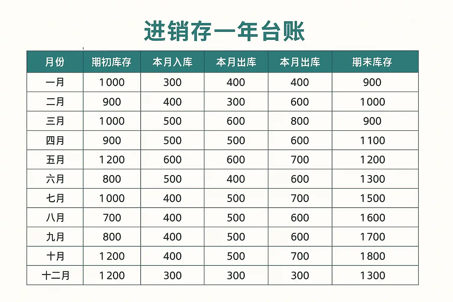 为便于理解,下列表格展示了典型的一年期进销存台账样式: