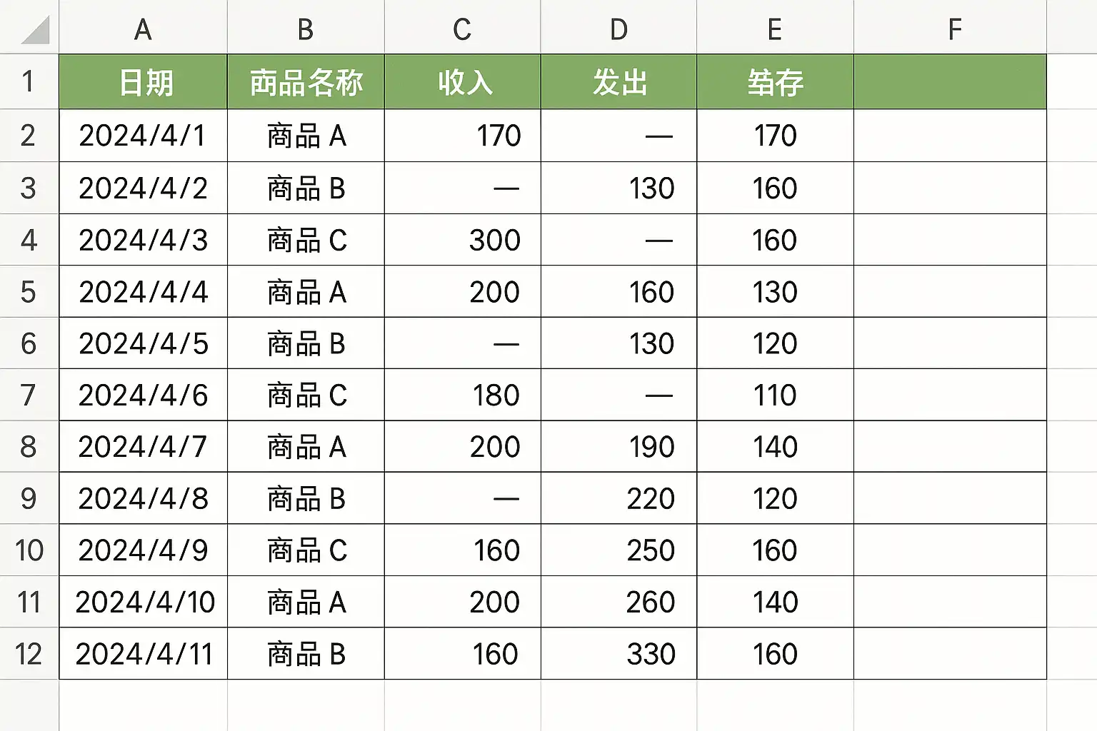 =SUMIFS(采购记录!数量, 商品编码, A2) - SUMIFS(销售记录!数量, 商品编码, A2)- 报表示例(Markdown格式)