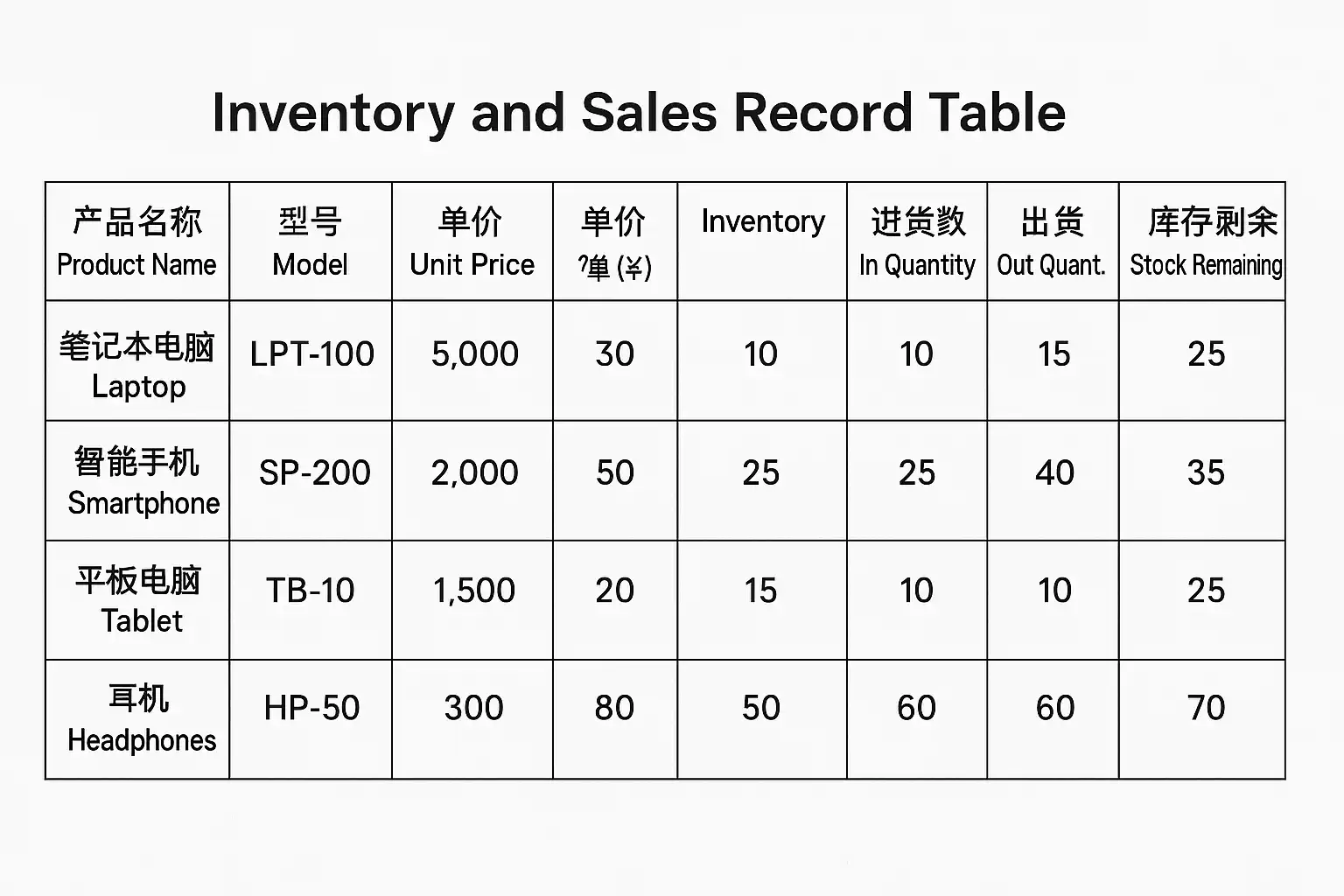 电子产品销售往往涉及采购员、仓管员和财务等多个岗位。良好的进销存表格应支持以下方面:
