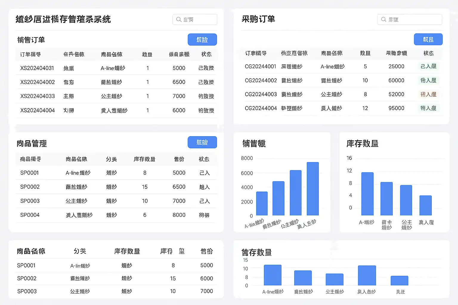 | 采购入库 | 新婚纱及配饰采购并登记入库 | 商品编码生成、多属性录入(品牌/尺码/色号) |