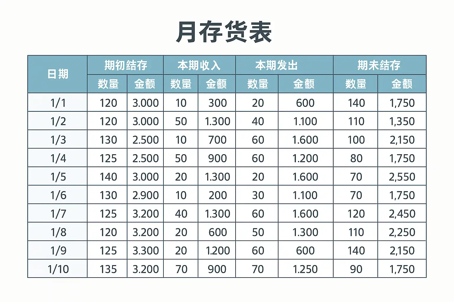 - 月底需统计全部SKU本期起始数量、本月各类收发明细及结余;