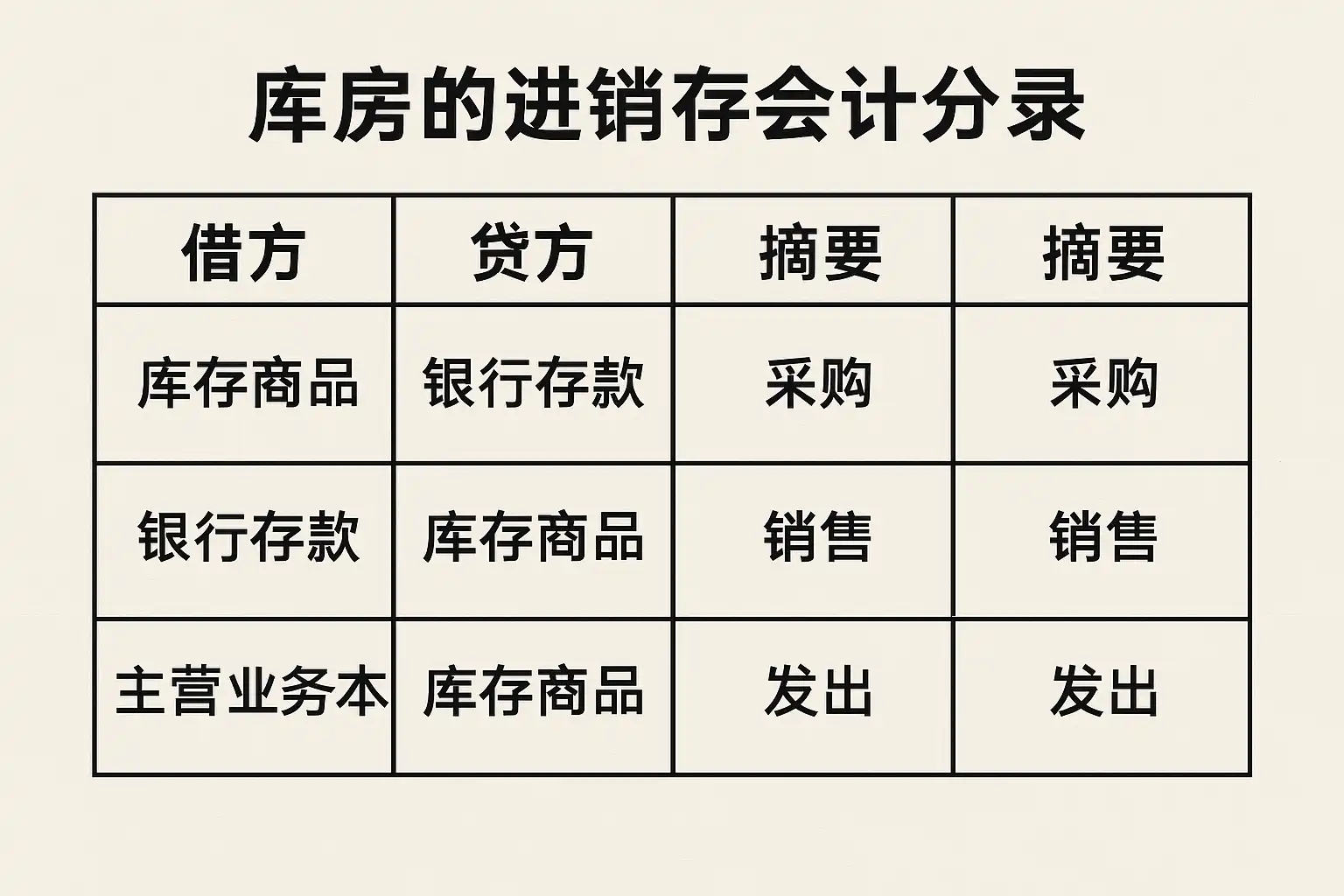 | 采购入库 | 库存商品 | 应付账款/银行存款 | 入库时登记增加库存,同时形成负债或减少现金 |