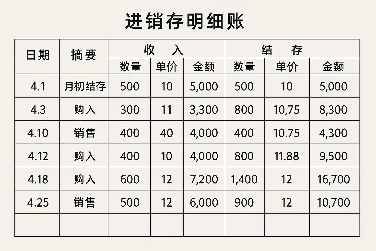 - 结余栏目:反映每笔业务后剩余的库存数量和金额。