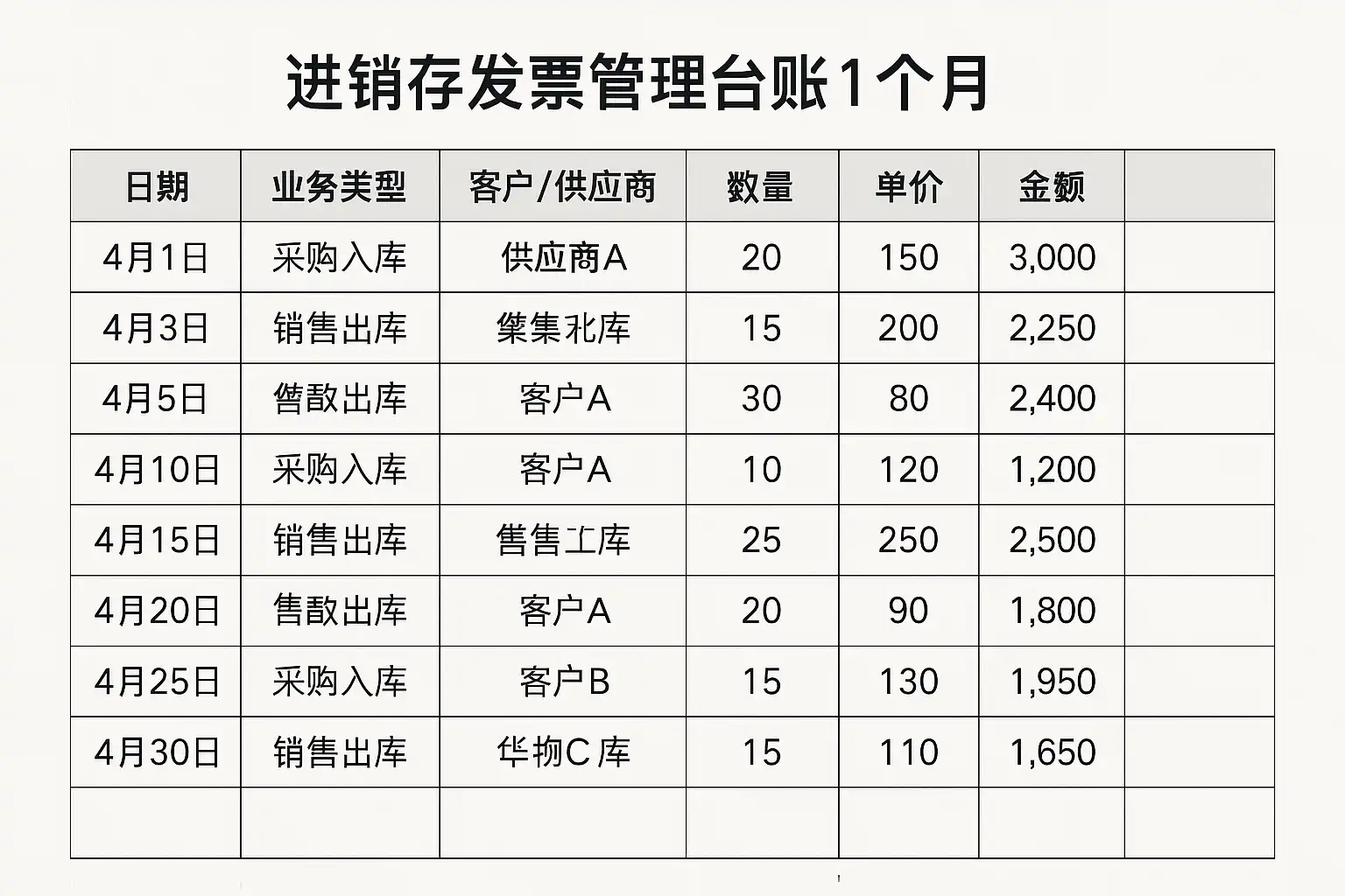 | 日期 | 单据类型 | 商品名称 | 数量 | 单价 | 金额 | 对方单位 | 发票号码 | 开具日期 ||------------|------------|--------------|--------|--------|---------|-----------------------|------------------|------------|| 2024-06-01 | 入库(采购) | A材料 | 100 | ¥10 | ¥1,000 | XX供应商 |12345678 |2024-06-02 ||2024-06-05| 出库(销售) | B产品 | 50 | ¥20 | ¥1,000 | YY客户 |87654321 |2024-06-05 |... ... ... ... ... ... ... ... ...填写要点提示