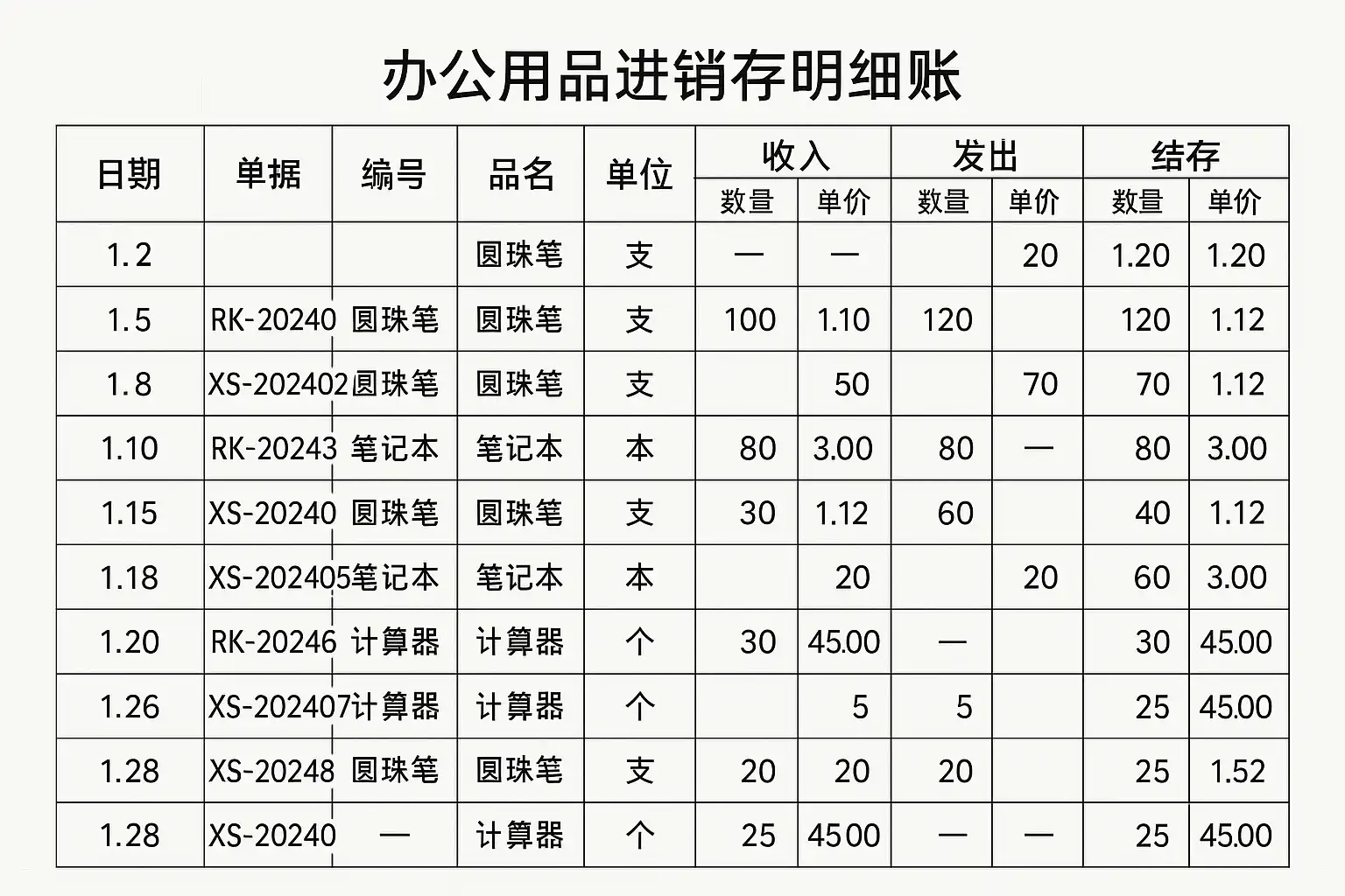 明细账定义 办公用品进销存明细账,是记录公司内部所有办公物资采购(进)、发放(出)及库存(存)动态变化的台账工具。