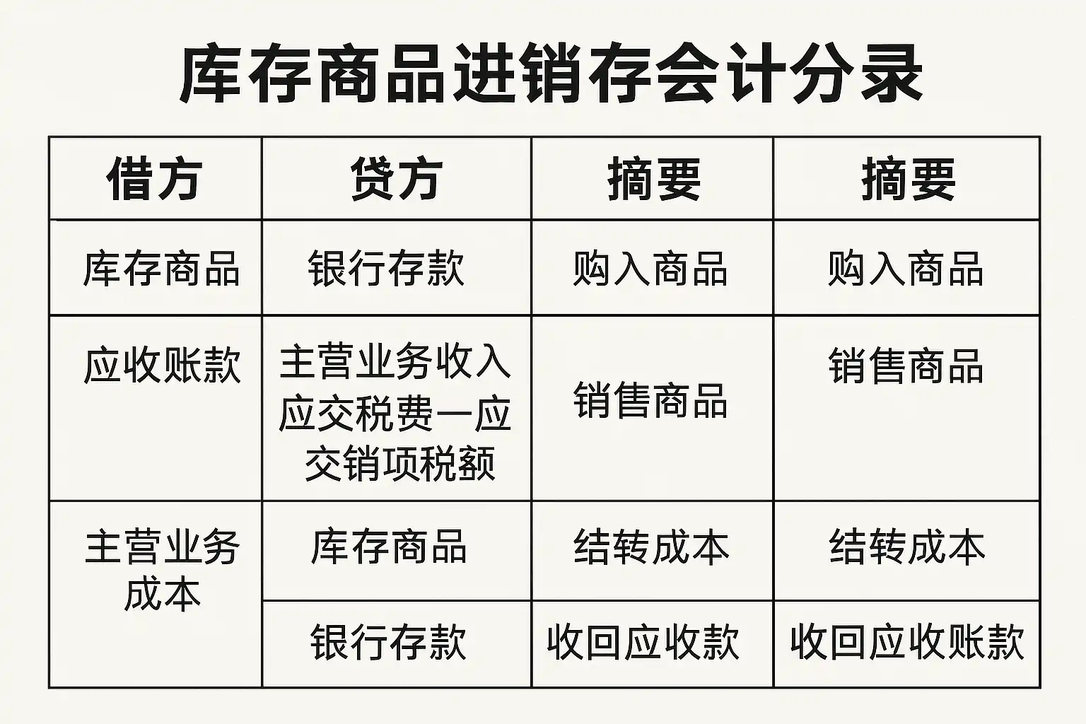 | 发出商品结转成本 | 主营业务成本 | 库存商品 |