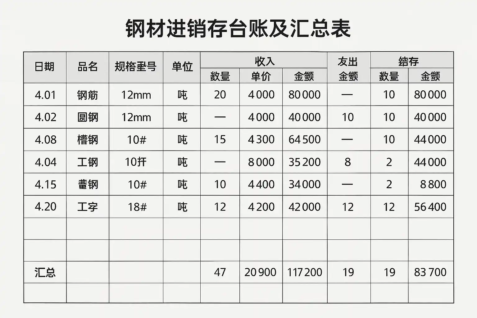 四、标准钢材进销存台账及汇总表模板示例