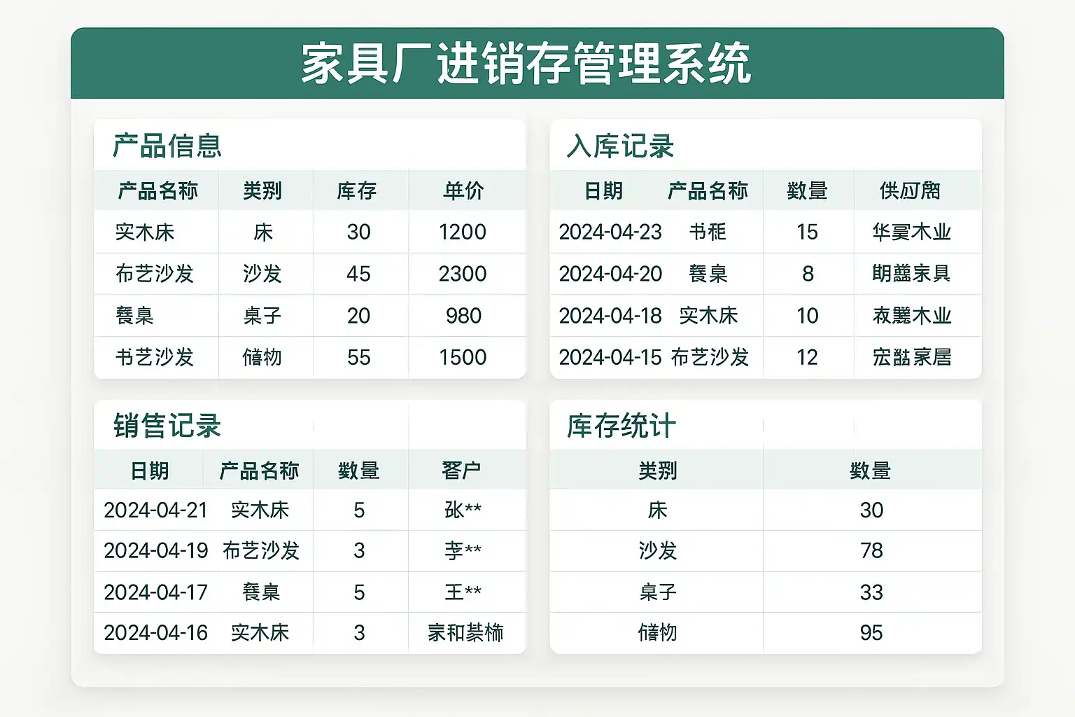 一个完整的家具厂进销存管理系统应包含以下核心功能: