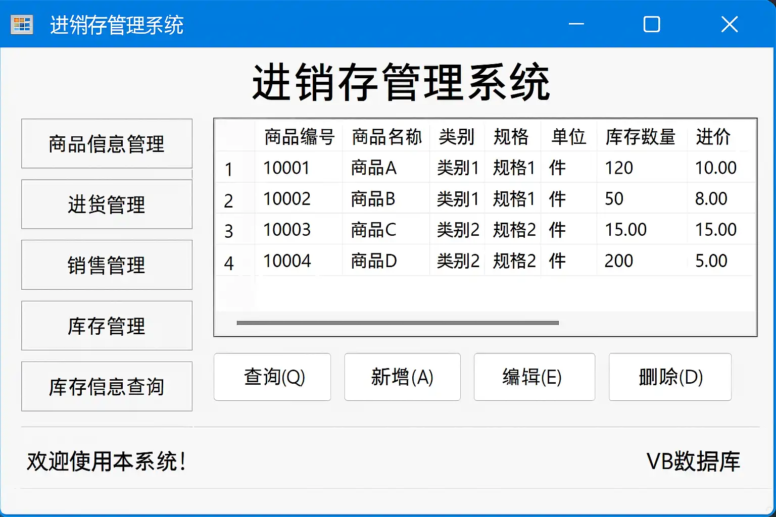 进销存系统主要涵盖商品管理、采购管理、销售管理、库存管理和报表统计等模块。在使用VB进行开发之前,需要明确以下需求: