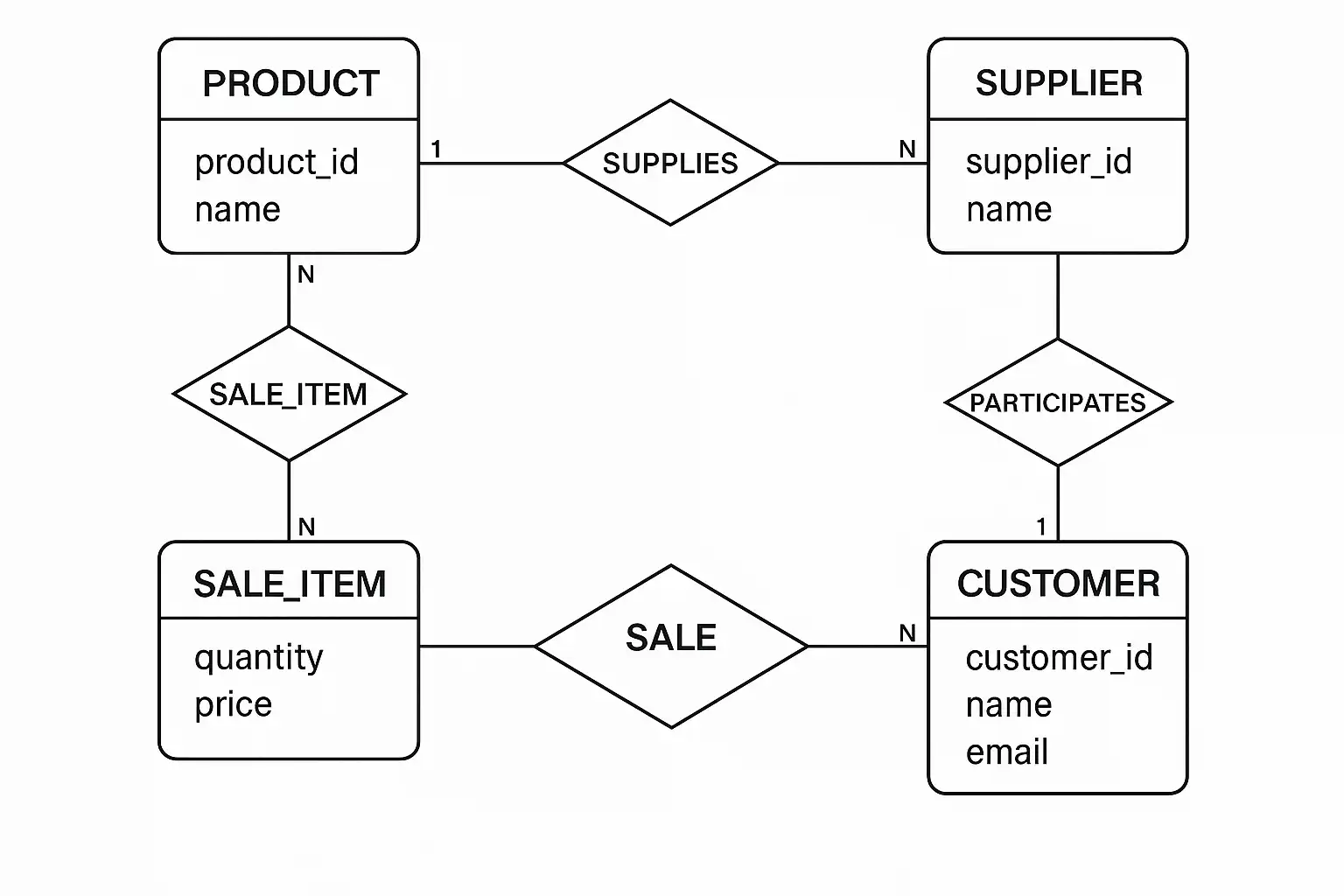 - 联系(Relationship):描述两个或多个实体之间的关联,如“供应商”向“商品”提供库存。