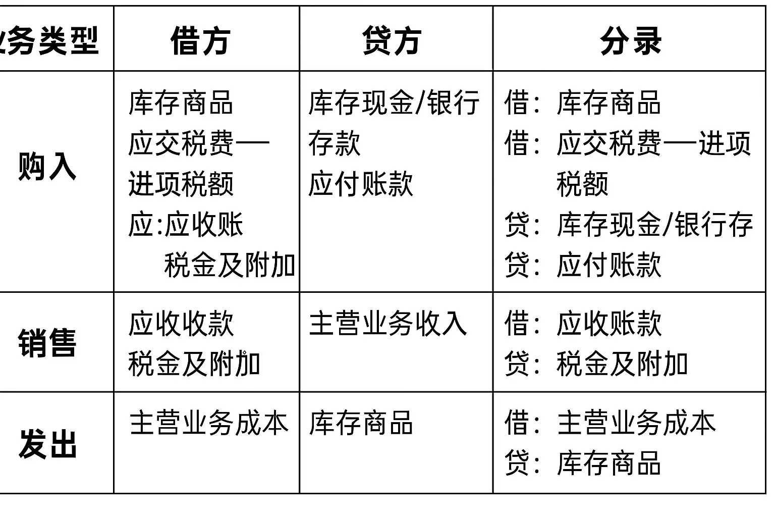 | 采购入库 | 库存商品 | 应付账款/现金 | 增加库存,同时形成债务/支付 |