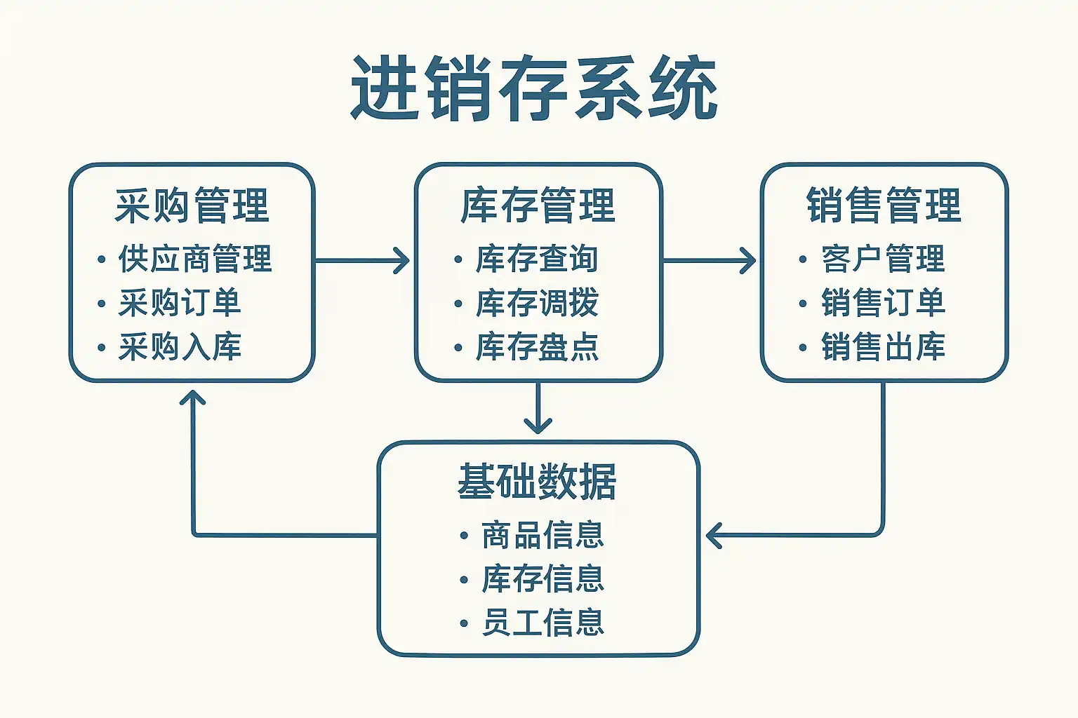 标准进销存系统一般包含以下模块,每个模块又细分为若干子功能: