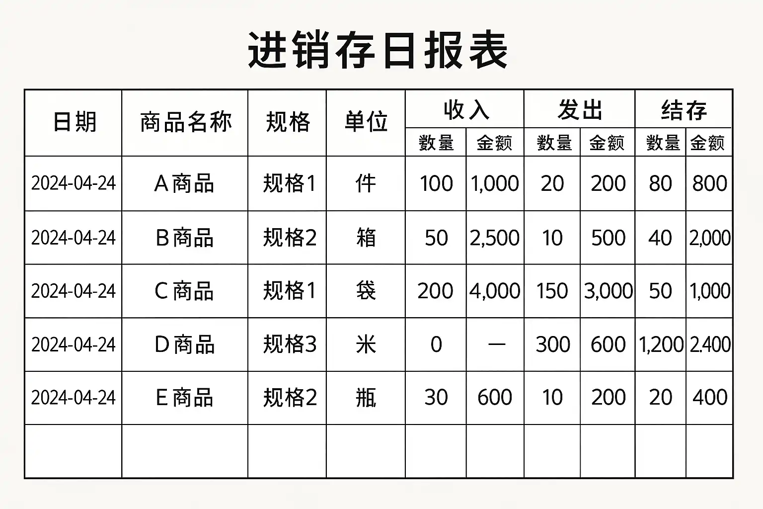 - 列清晰划分:例如分别列出商品编码、名称、入库量、出库量和库存余额。