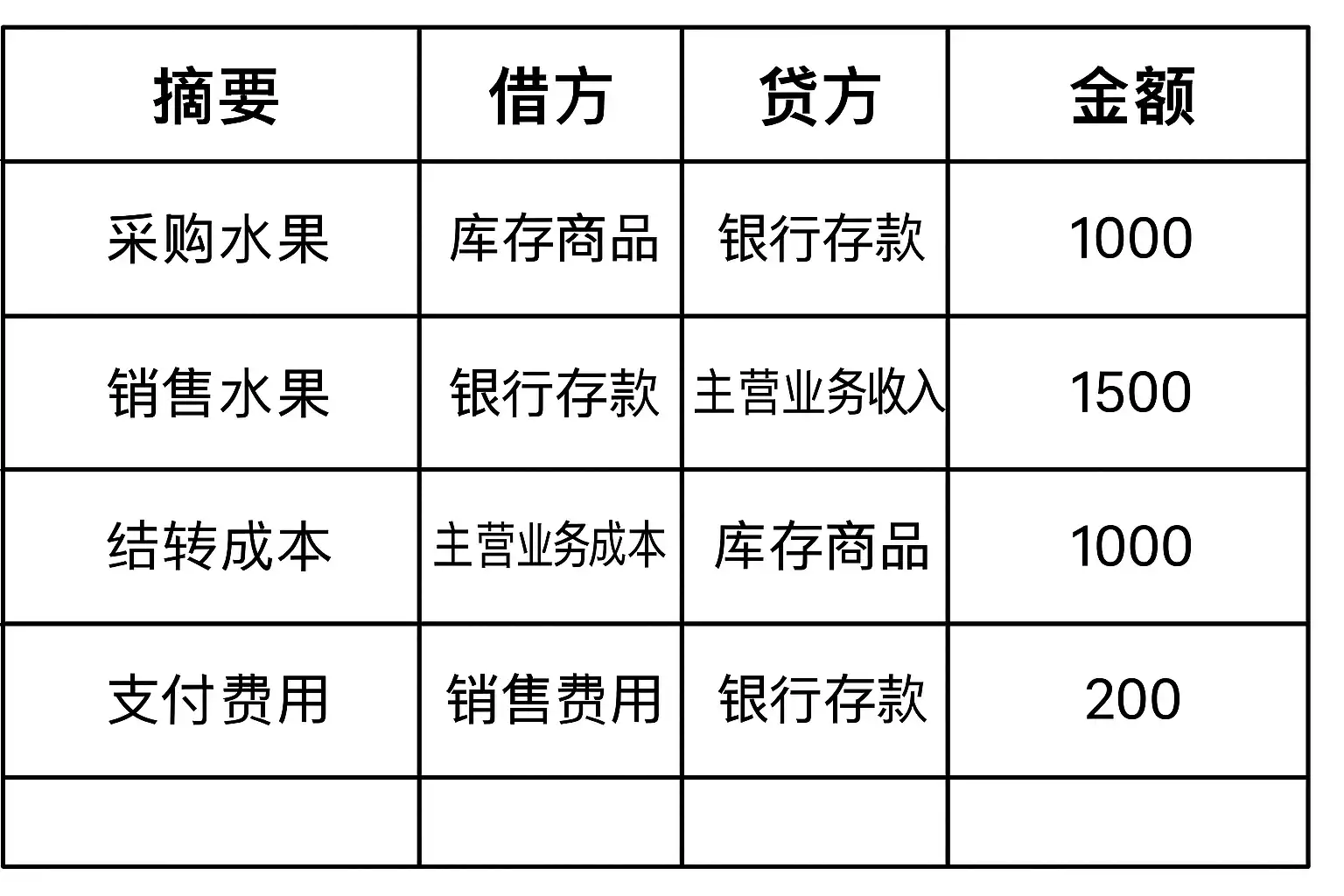 - 采购环节:购买水果时,增加“库存商品”,如赊购则增加“应付账款”;现金购则减少“库存现金”。