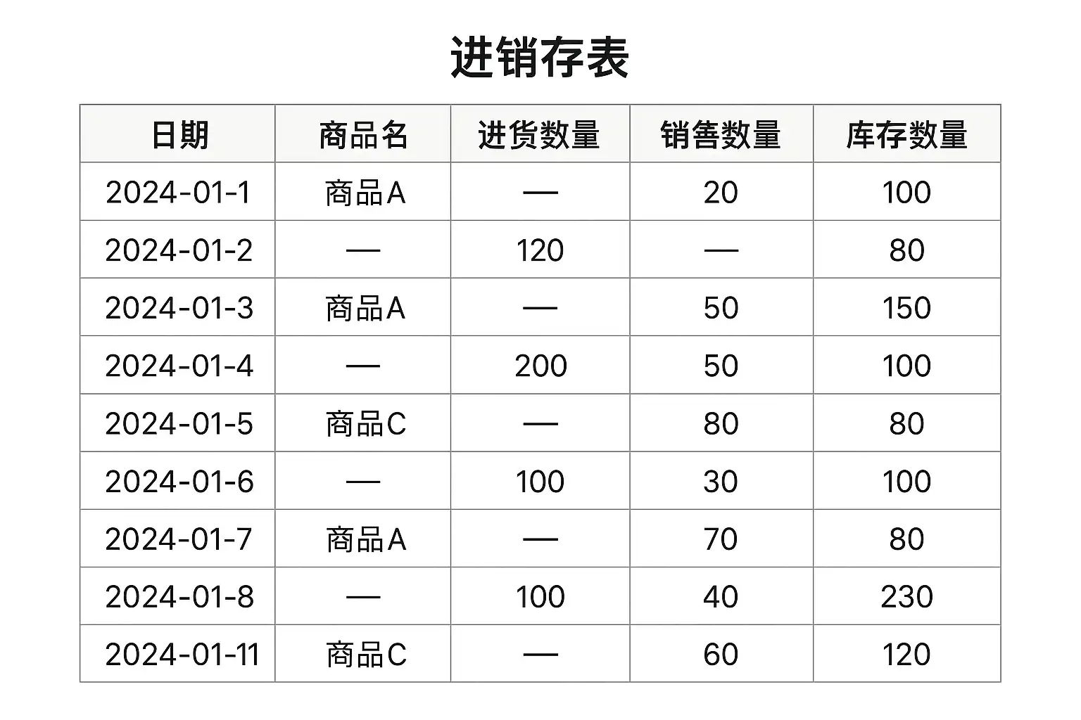 - 建议: 在设计时可根据企业实际业务流程增减字段,如批次号、货架位置等,便于后续查询与追溯。