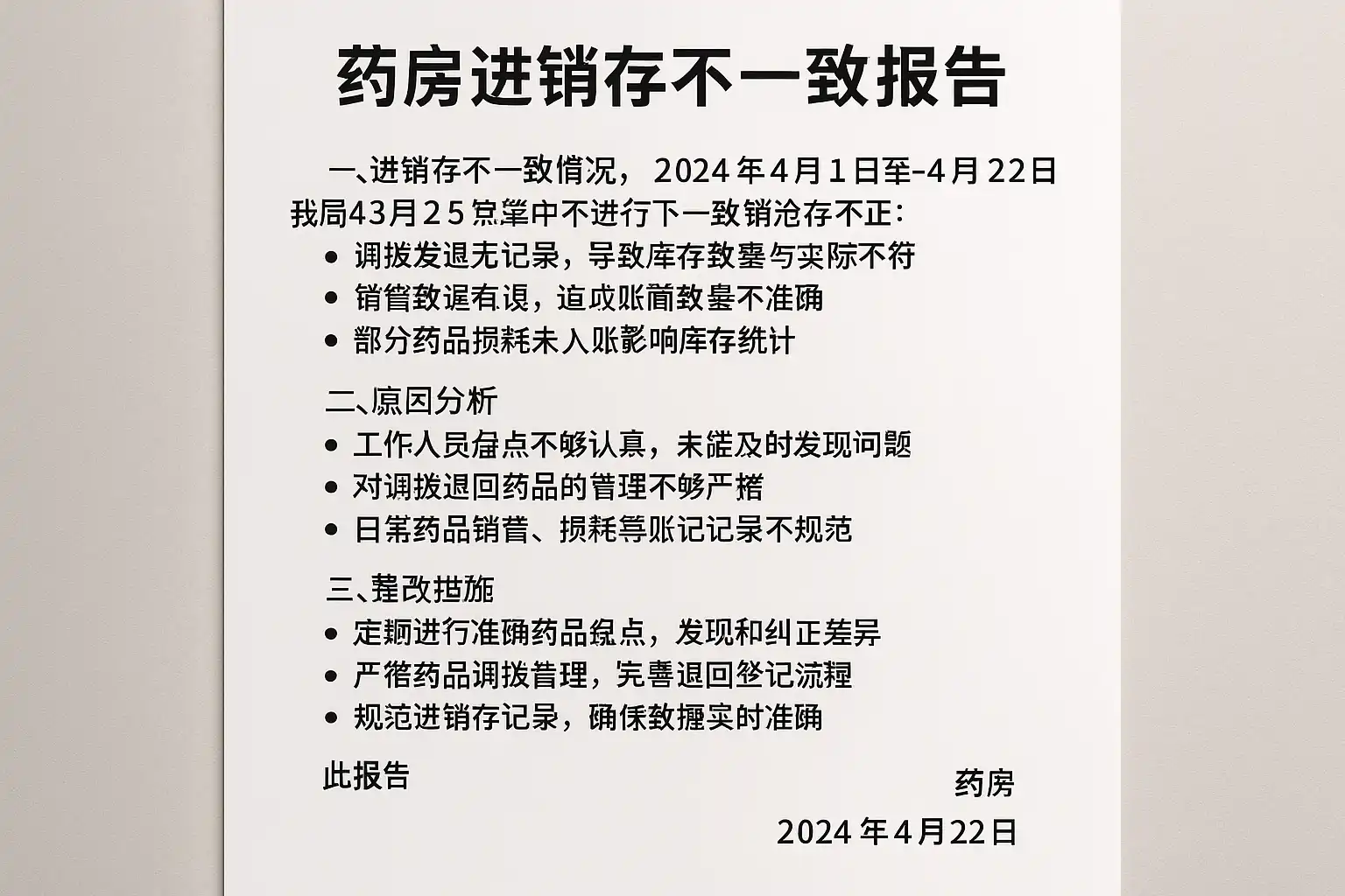 当发现药房进销存数据不一致时,我不确定该如何规范、清晰地撰写报告,既能反映问题又能提出改进方案,希望了解具体报告结构和内容要求。