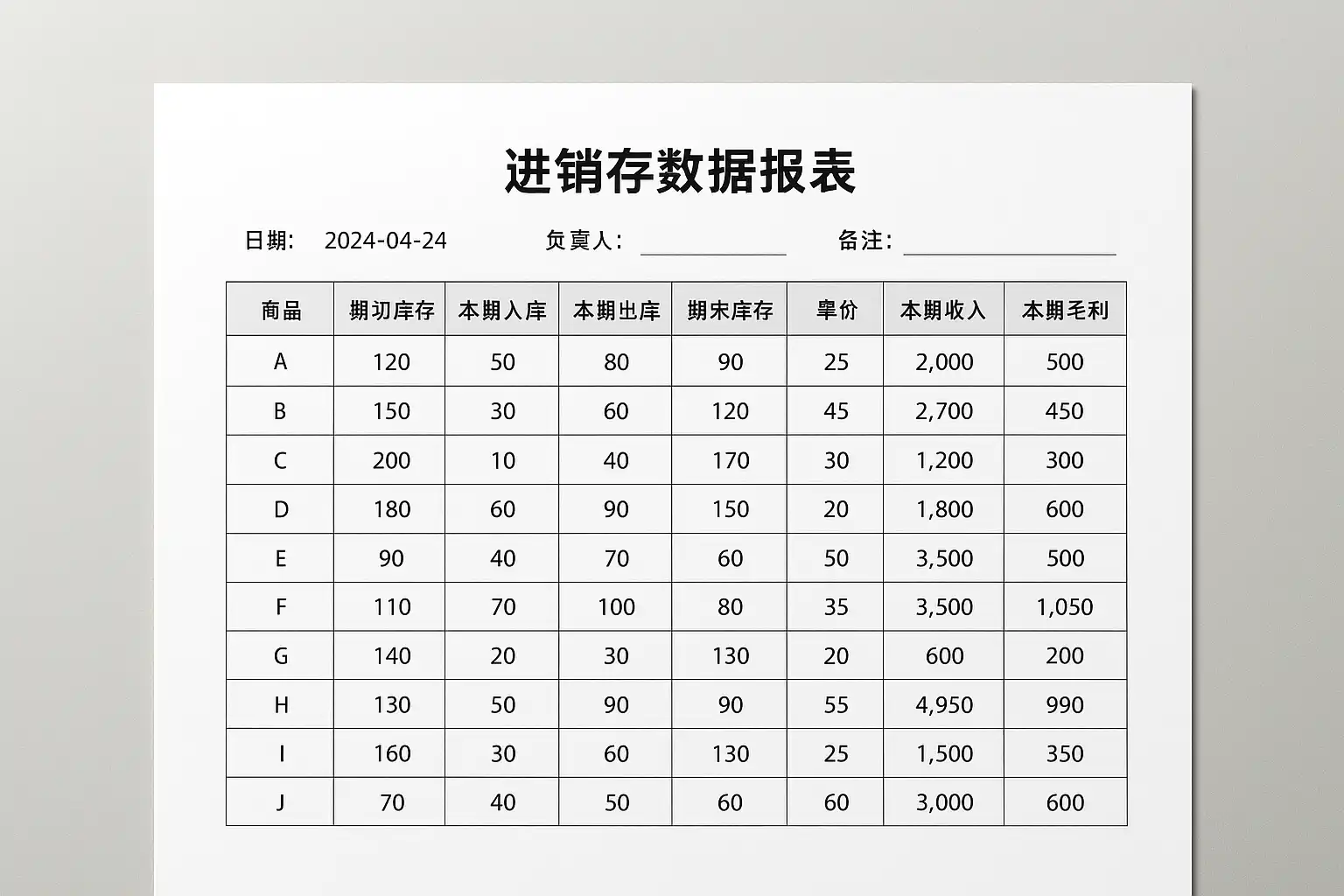- 常见包括商品名、规格型号、入库/出库日期及数量金额