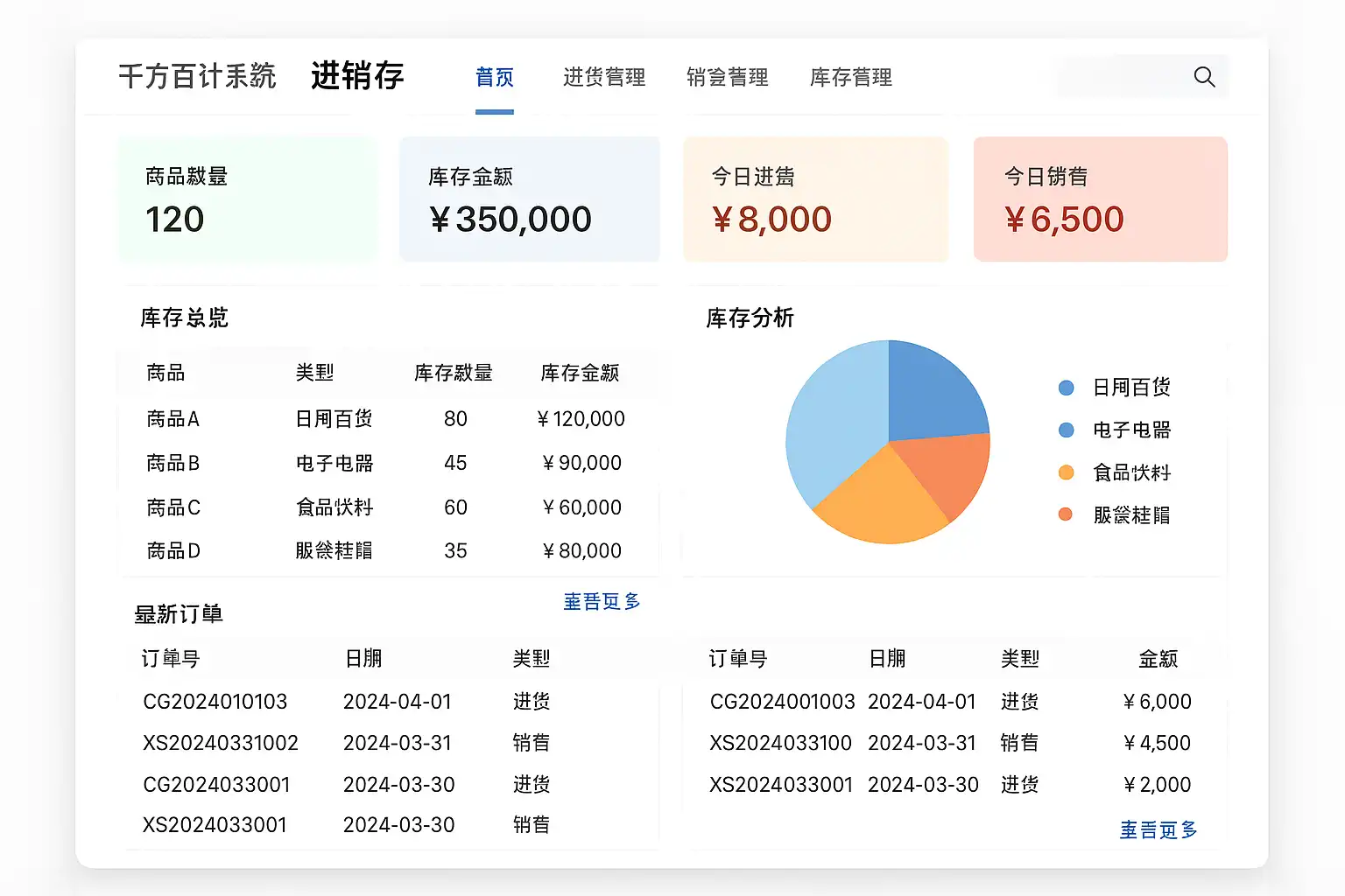 千方百计系统是一款针对中小型企业研发的信息化管理工具,其中进销存功能尤为核心。它通过数字化手段整合采购(进)、销售(销)、库存(存)三大业务流程,将原本分散的商品流转环节一体化管理,实现数据互通、流程可追溯,有效提升企业运营效率。