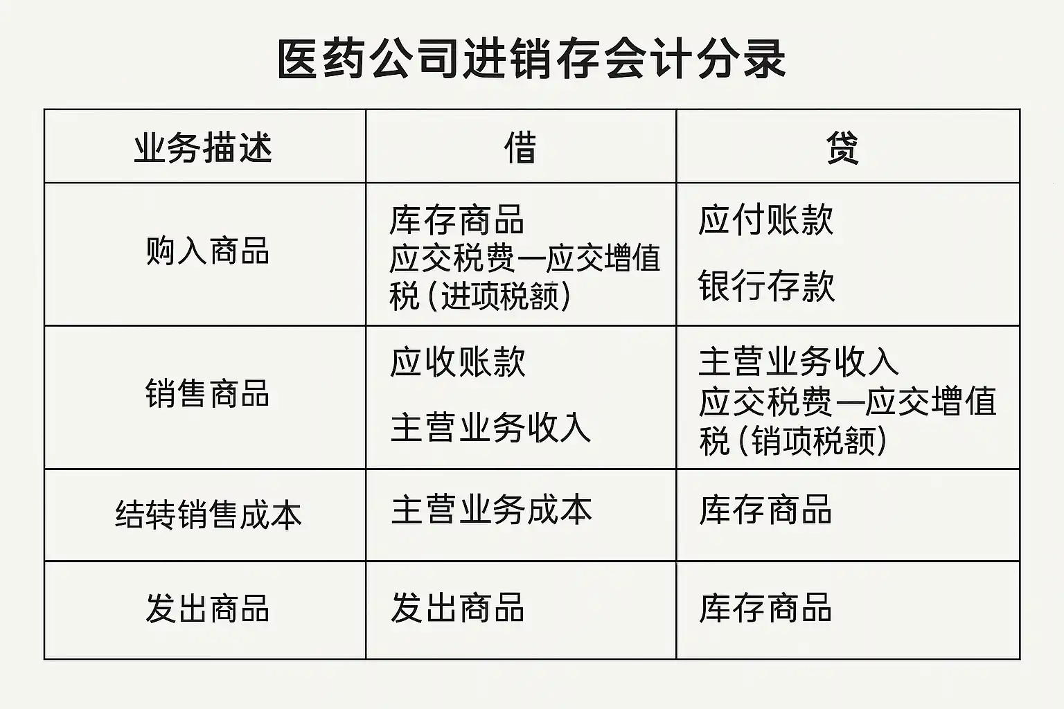 | 销售出库 | 药品销售 | 应收账款/主营业务收入/税金 | 借:应收账款;贷:主营业务收入、应交税费 |
