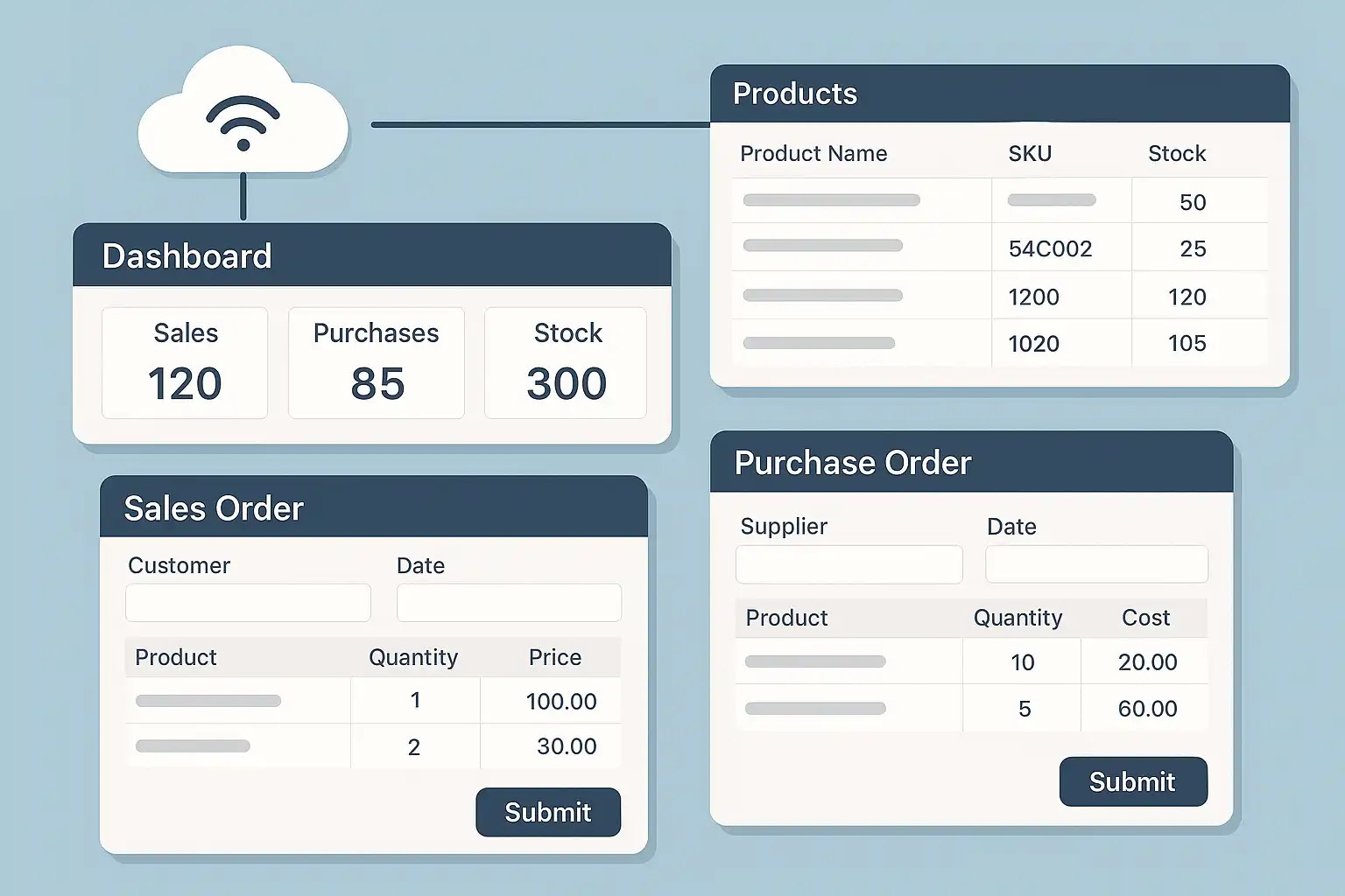 一个完善的联网进销存系统应当包含如下核心模块,每个模块既可以独立,也需互相联动: