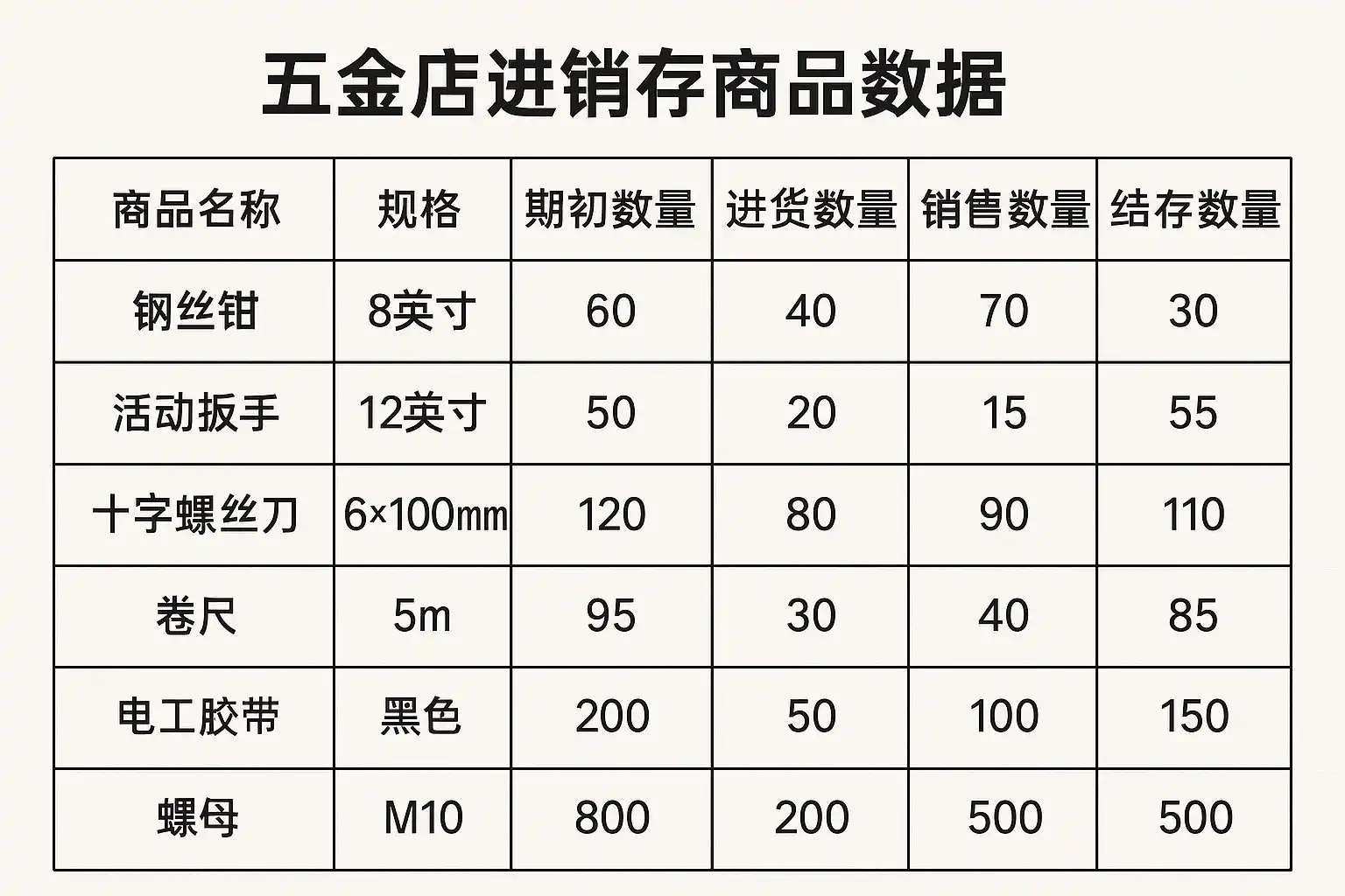 - 采购/销售流水表:反映每笔业务对应商品流向及金额。