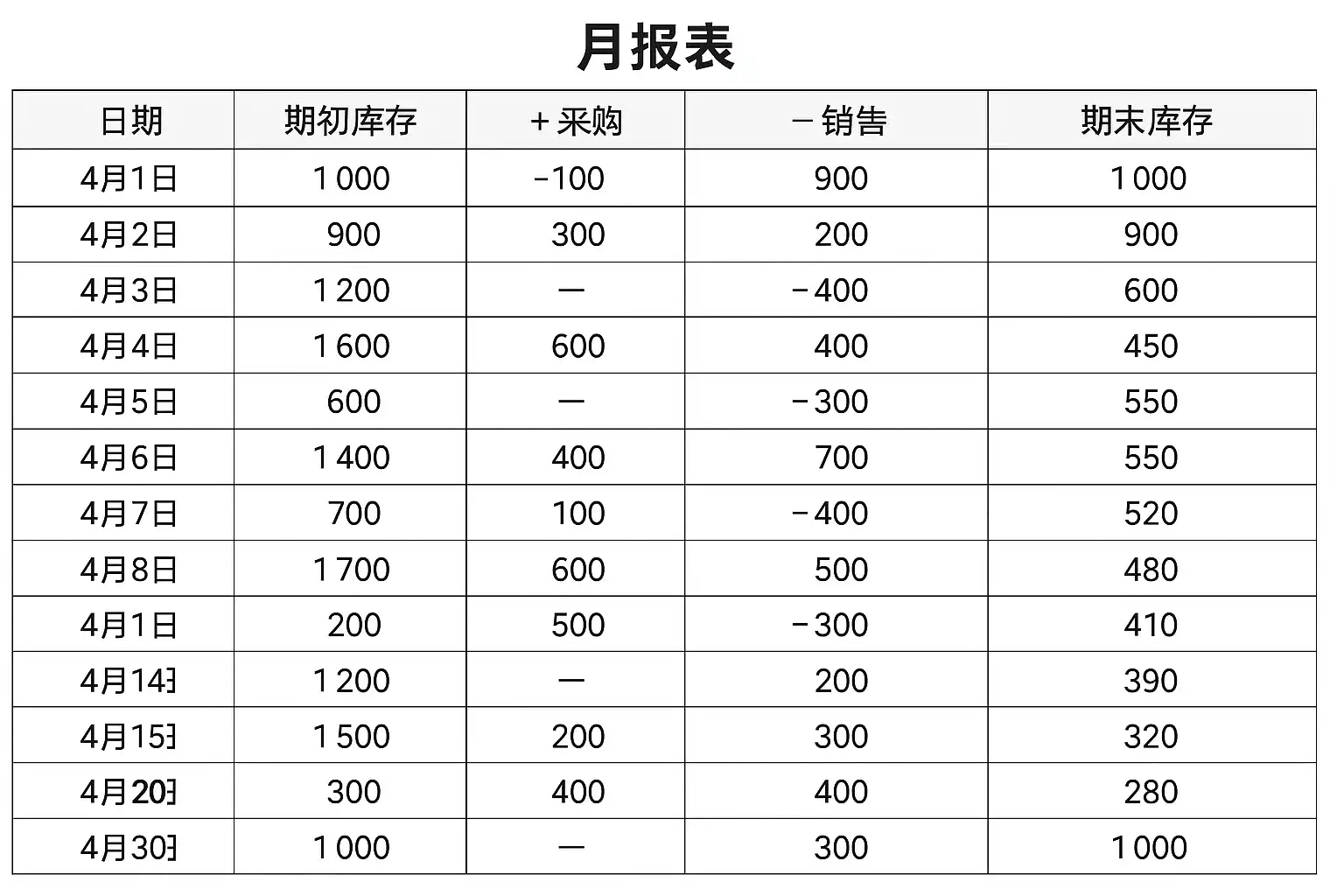 - 分析总结:通过数据趋势分析,发现库存积压或缺货问题。举例来说,如果某产品4月份采购500件,销售450件,则期末库存=期初库存+500-450。这样能清楚反映该月的进销存状况。