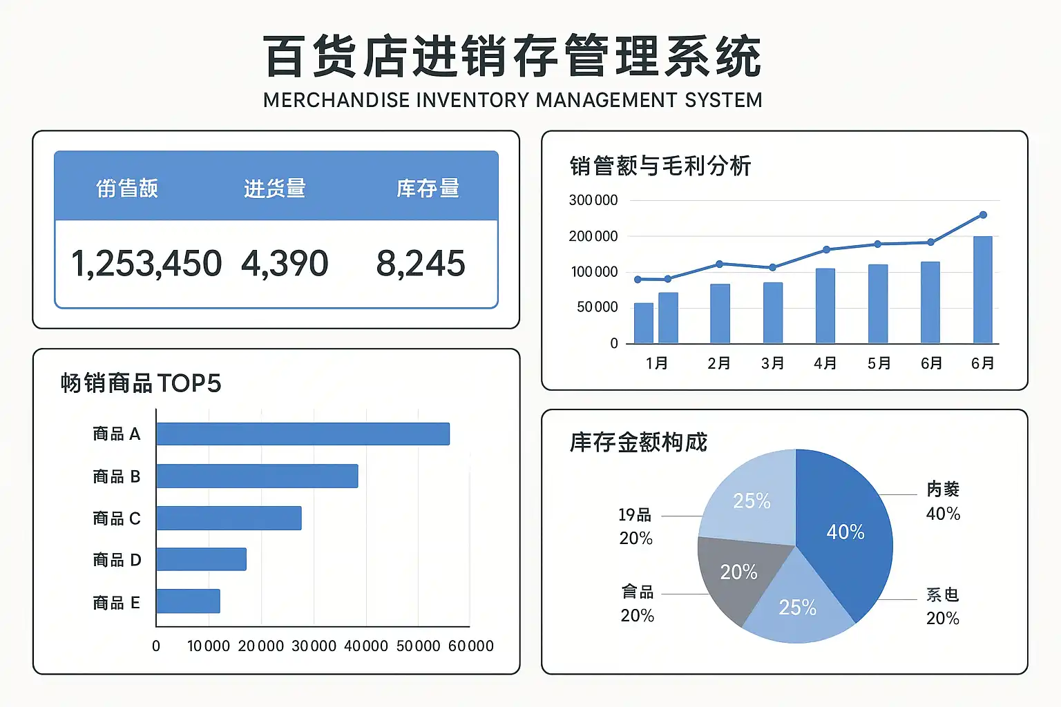 | 总库存金额 | 当前所有商品按成本价汇总 |