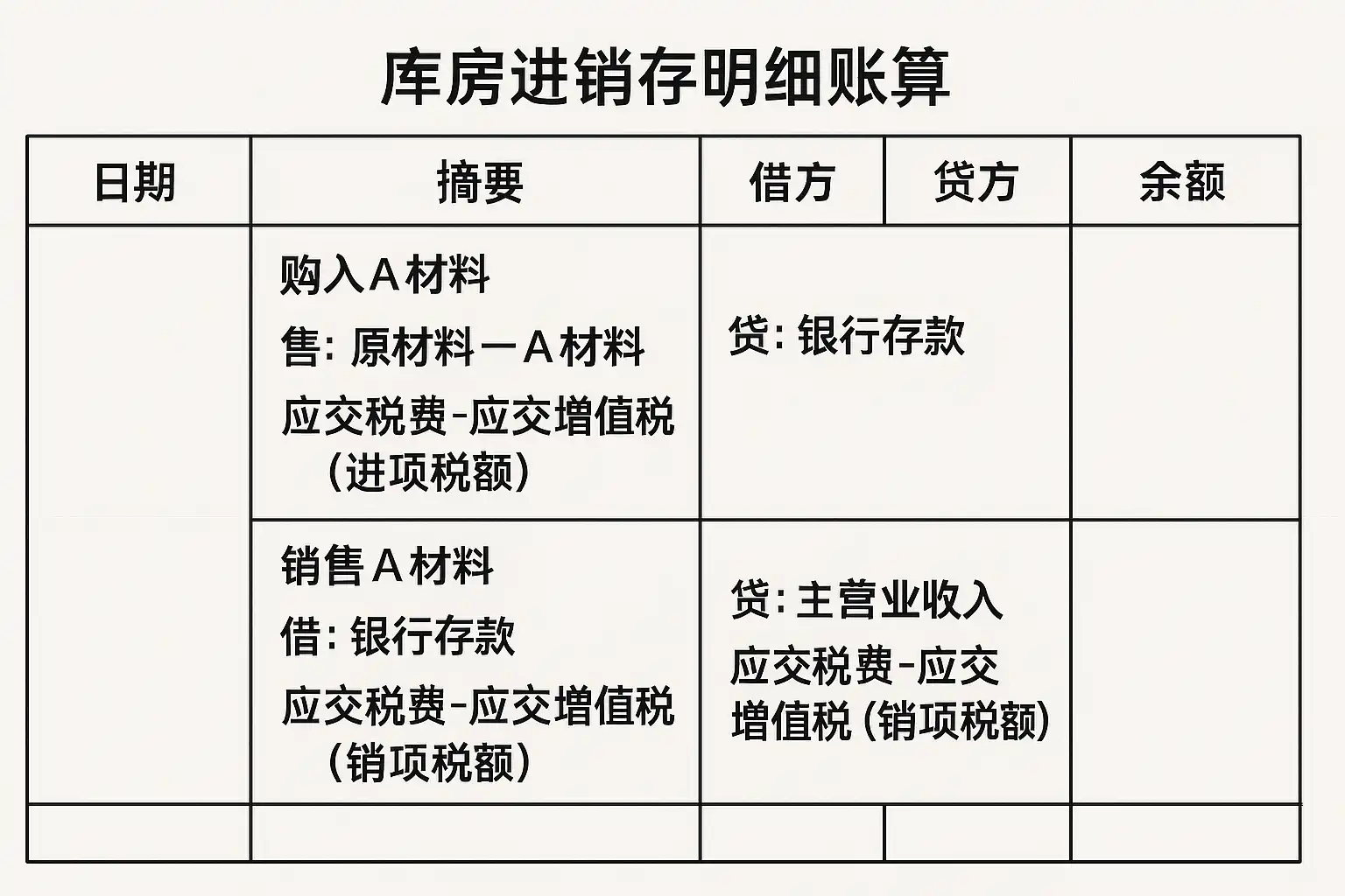 以下表格列举了主要几类涉及库房进销存明细账的典型经济业务及其标准会计分录: