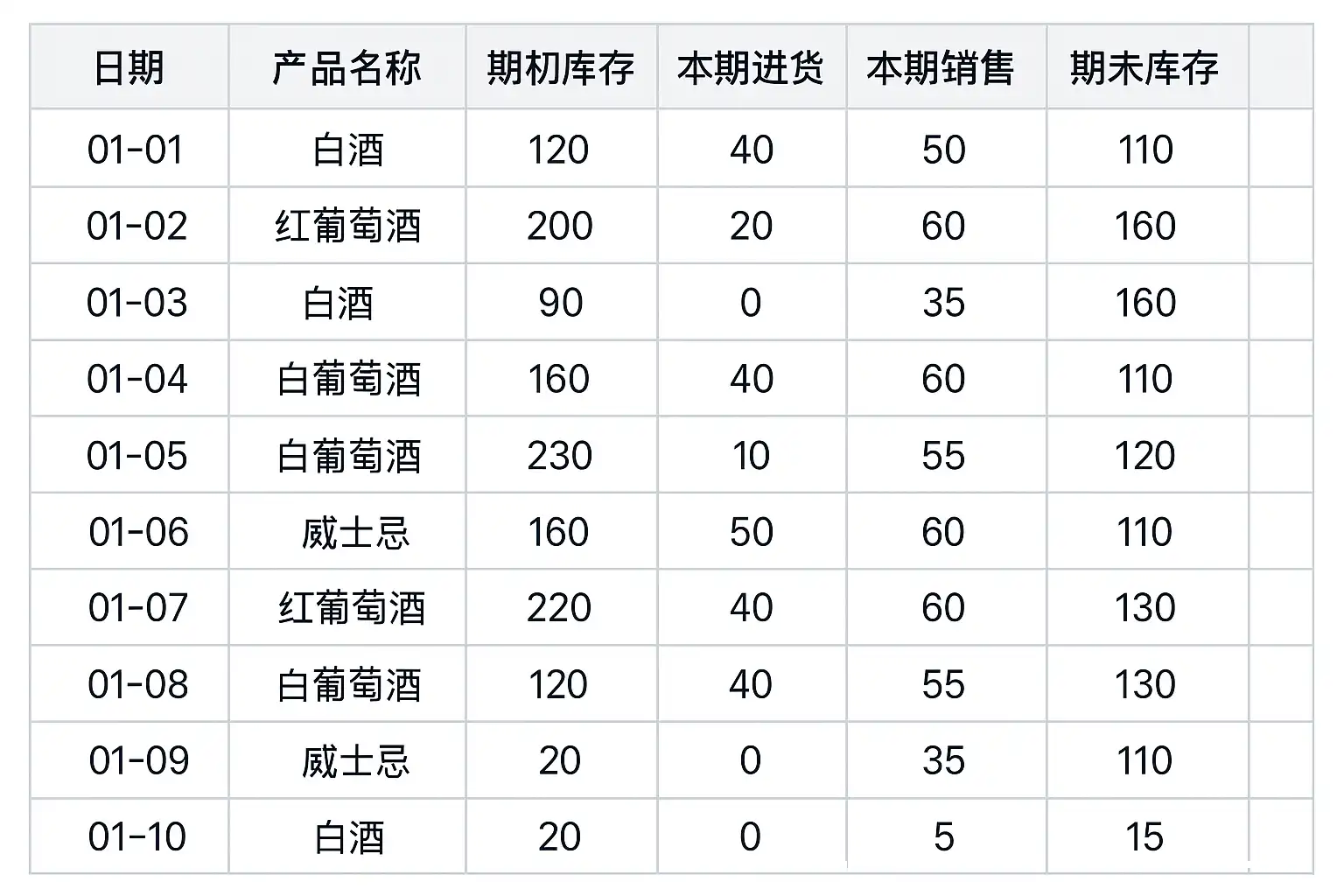- 安全库存(Safety Stock):为避免断货而设定的最低库存量,例如某品牌白酒安全库存为100瓶。