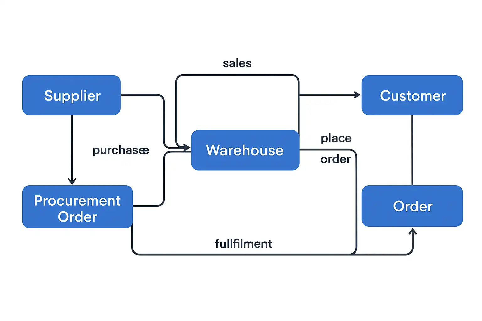 - 新购商品到达后,由仓管员验收入库 → 库存同步更新