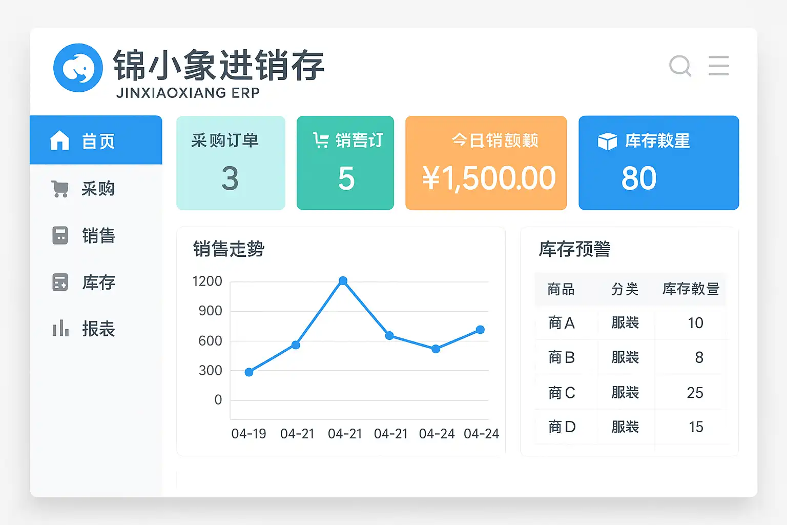 锦小象进销存系统主要涵盖采购管理、销售管理、库存管理、财务报表和客户关系管理五大核心功能。具体包括: