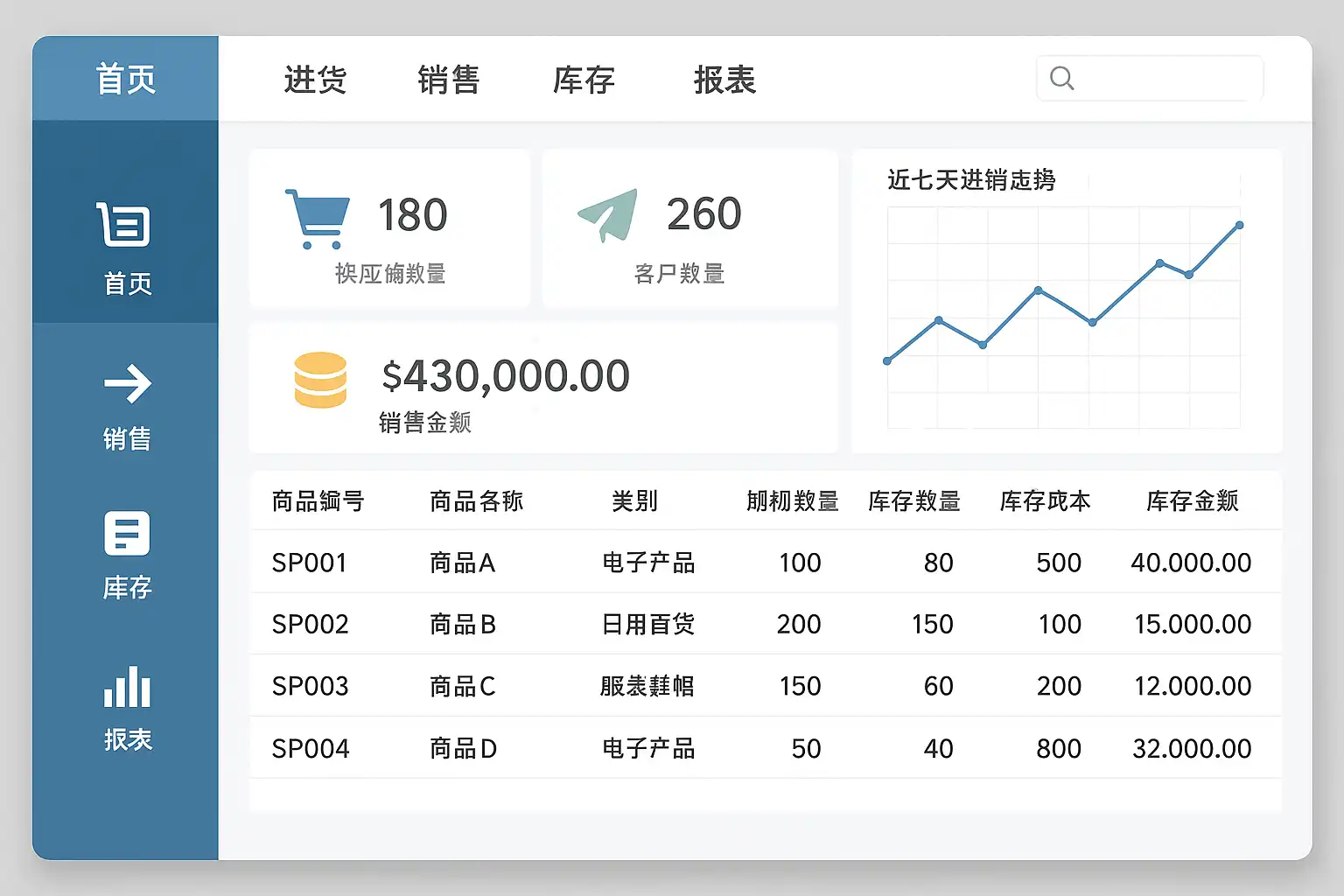 - 决策支持:内置数据分析工具提供销售趋势和库存预警。