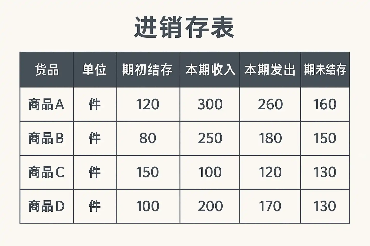 | 2024-05-01 | A产品 | 件 | 100 | 50 | 80 | 70 |