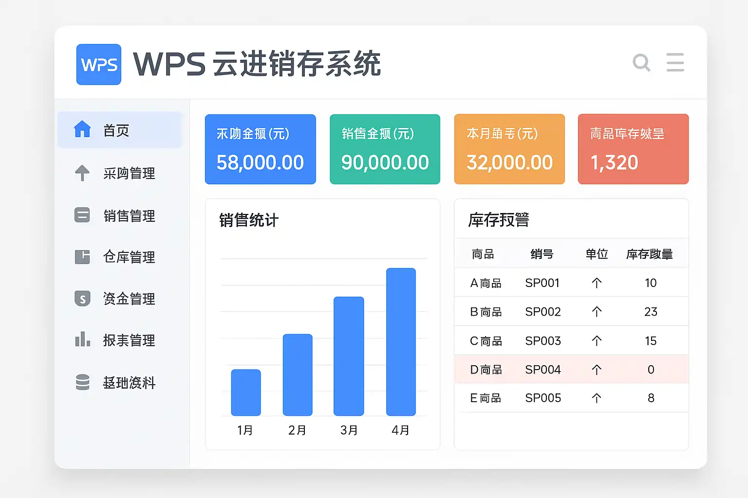 WPS 云进销存系统是金山办公基于 WPS Office 云服务推出的一套适合中小企业的进销存管理解决方案。该系统依托WPS强大的文档处理和表格编辑能力,将采购、销售、库存的各项流程整合到一个平台内,实现业务数据一体化管理。