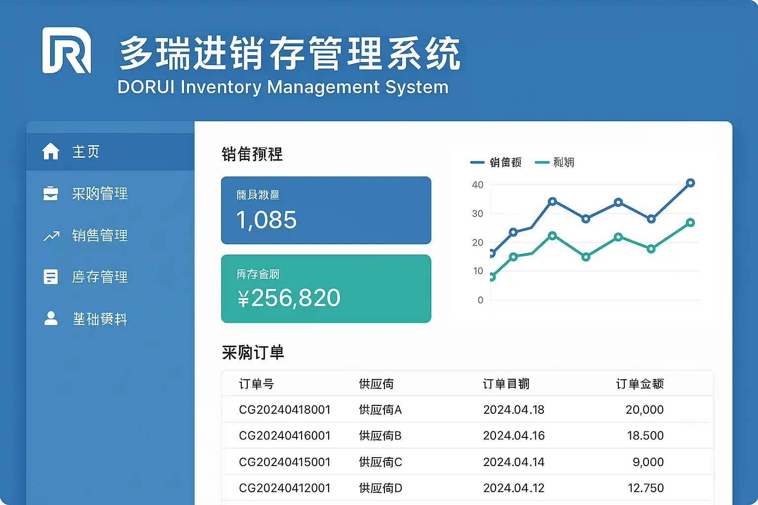 多瑞进销存管理系统采用简洁直观的用户界面设计,支持模块化布局,方便用户快速定位所需功能。其主要特点包括:
