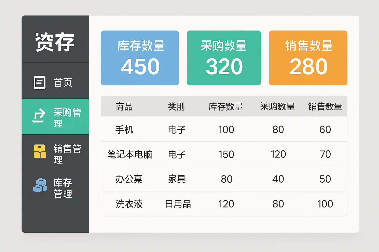 - 数据分析报表:自动生成多维度报表,如月度采购汇总表、商品销量趋势图等。