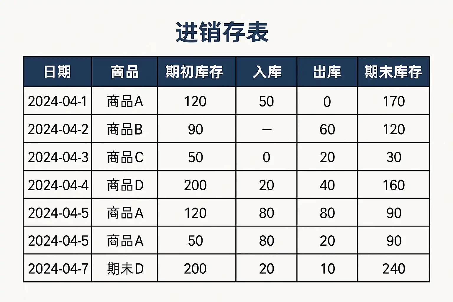 | 库存明细表 | 商品名称/编号、规格型号、单位、库存数量等 | 实时掌握商品剩余量及仓库分布 |