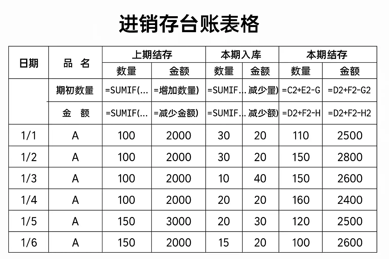 一、进销存台账表格核心公式说明