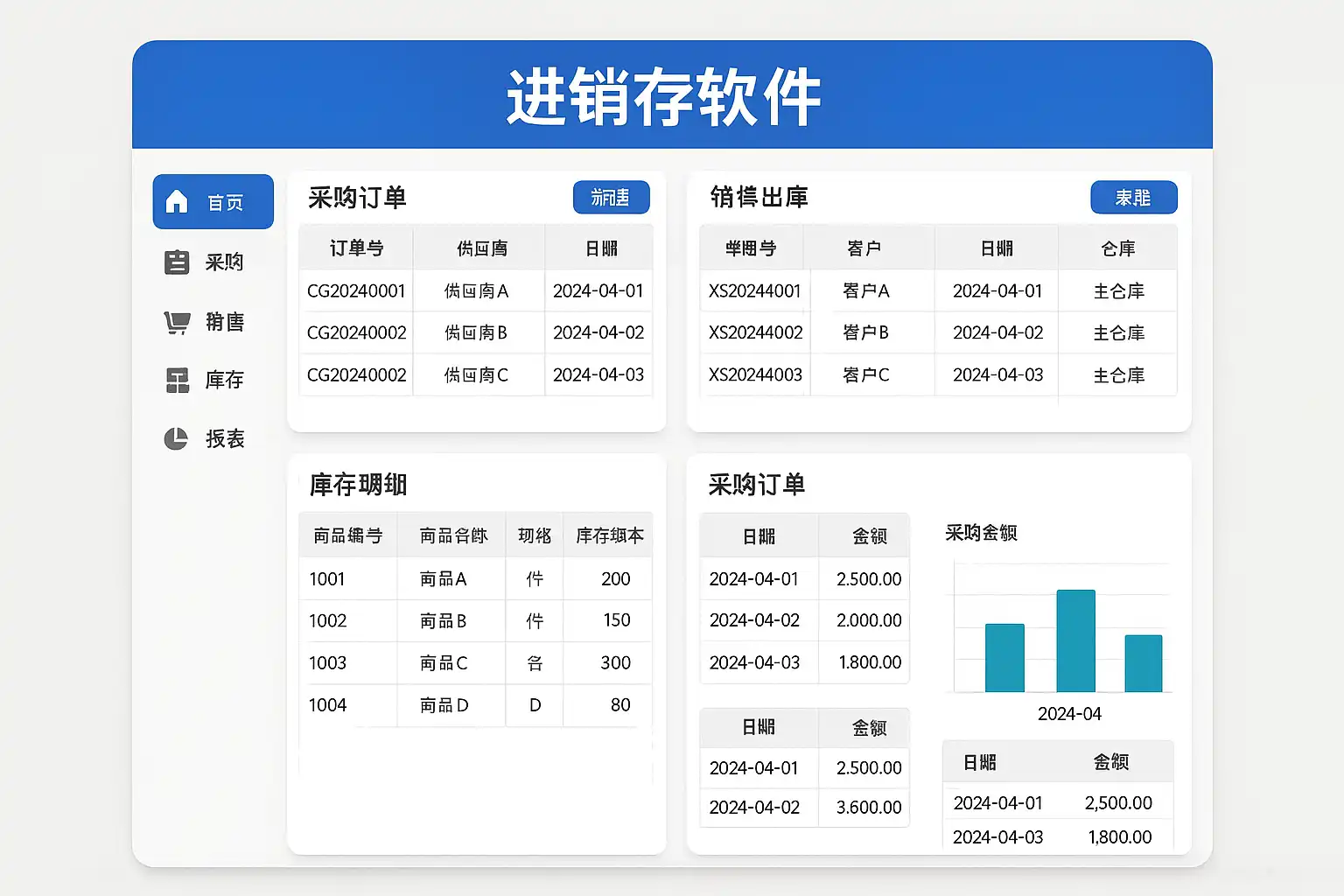 | 采购管理 | 供应商录入、采购单生成 | 简单易上手 | 功能较为单一 |
