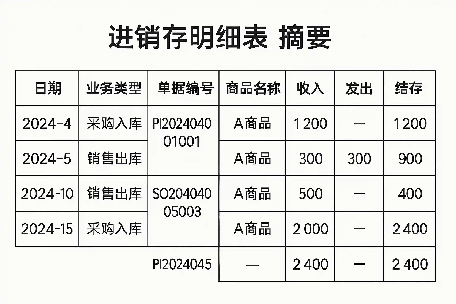 | 2024-06-01 | A产品 | 件 | 100 | 50 | 30 | 120 | 月初+新到货 |